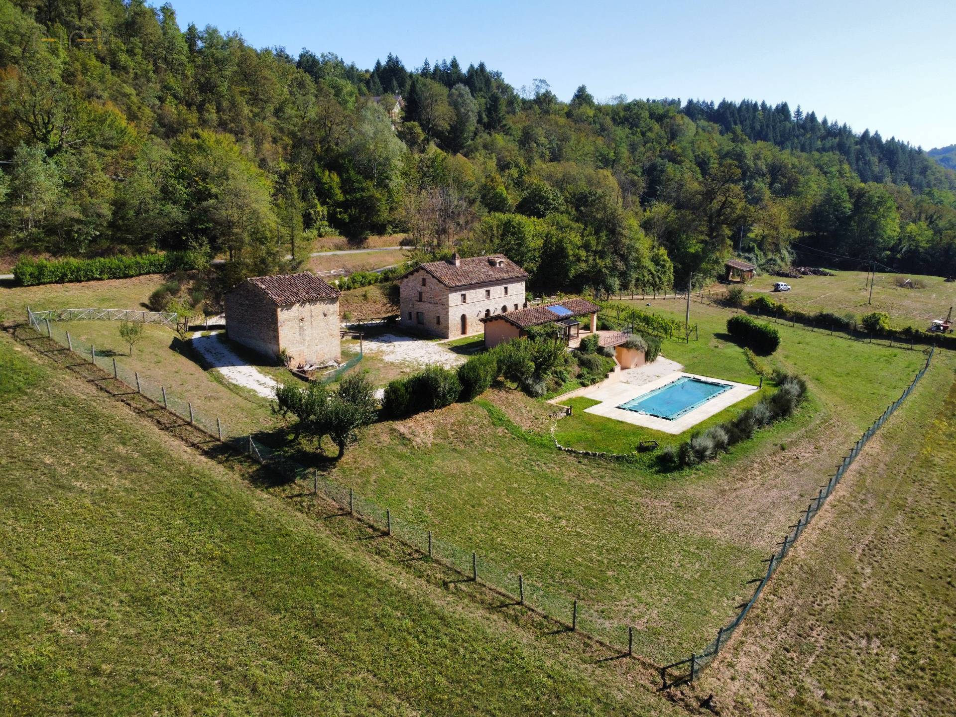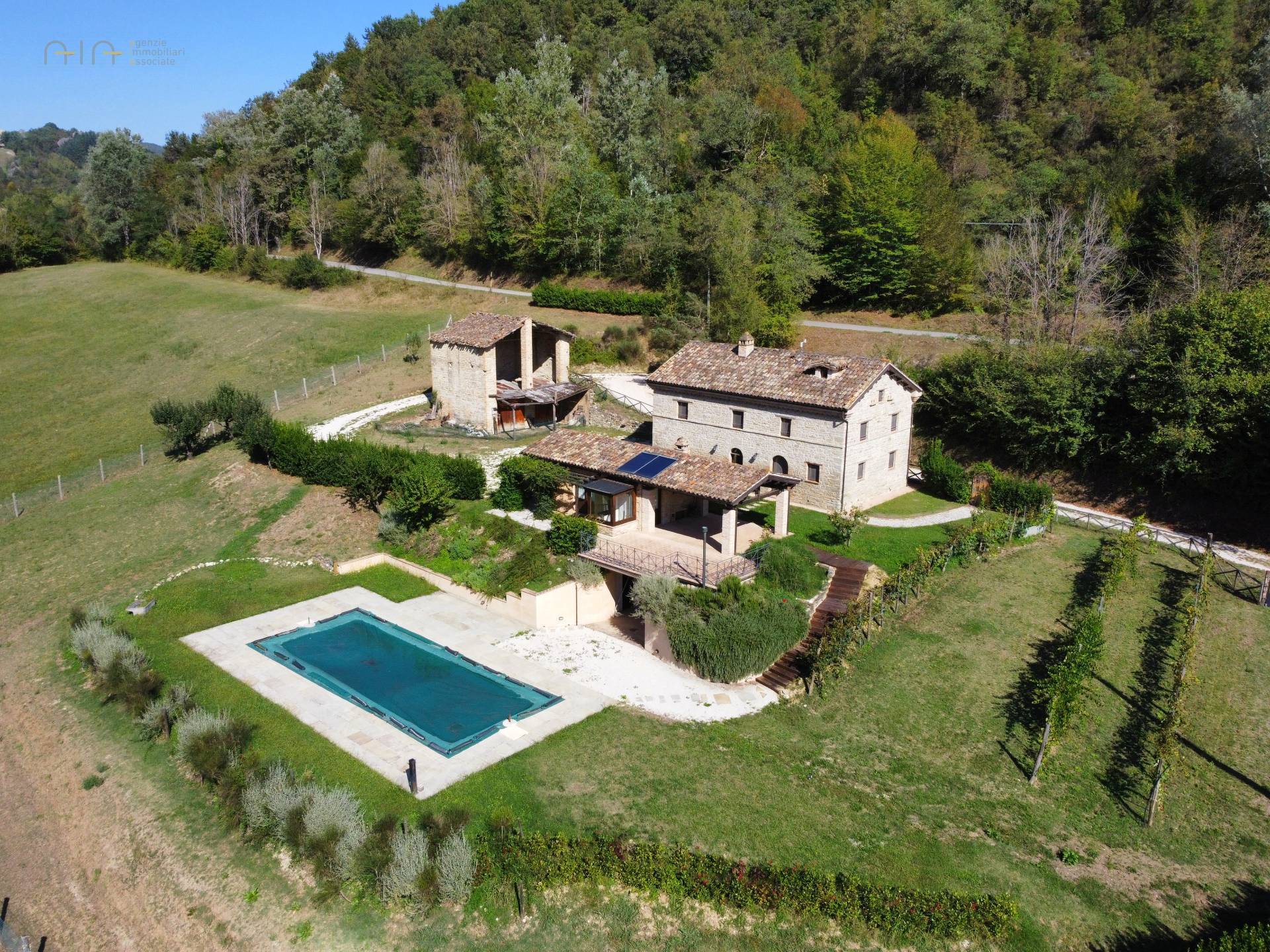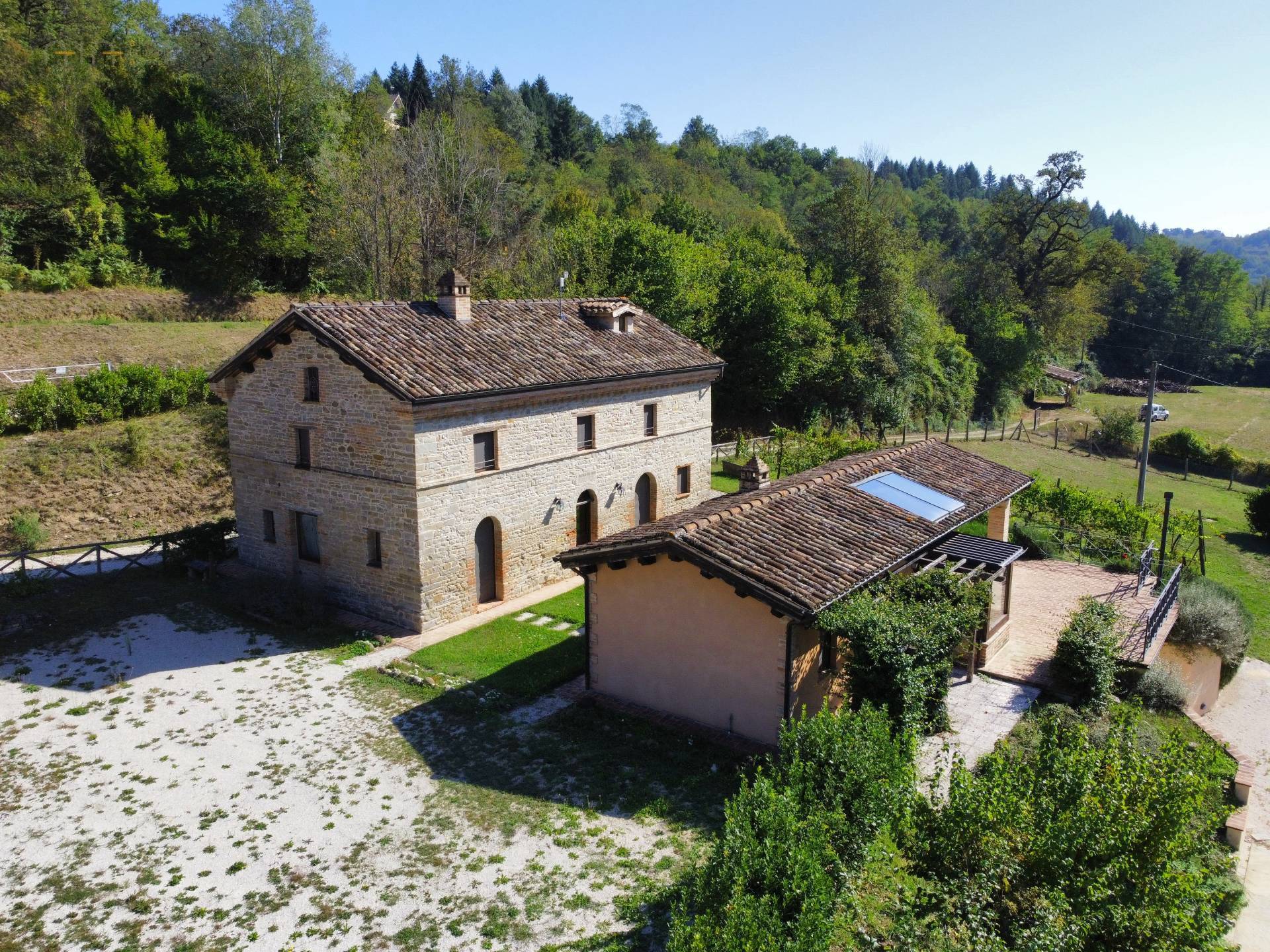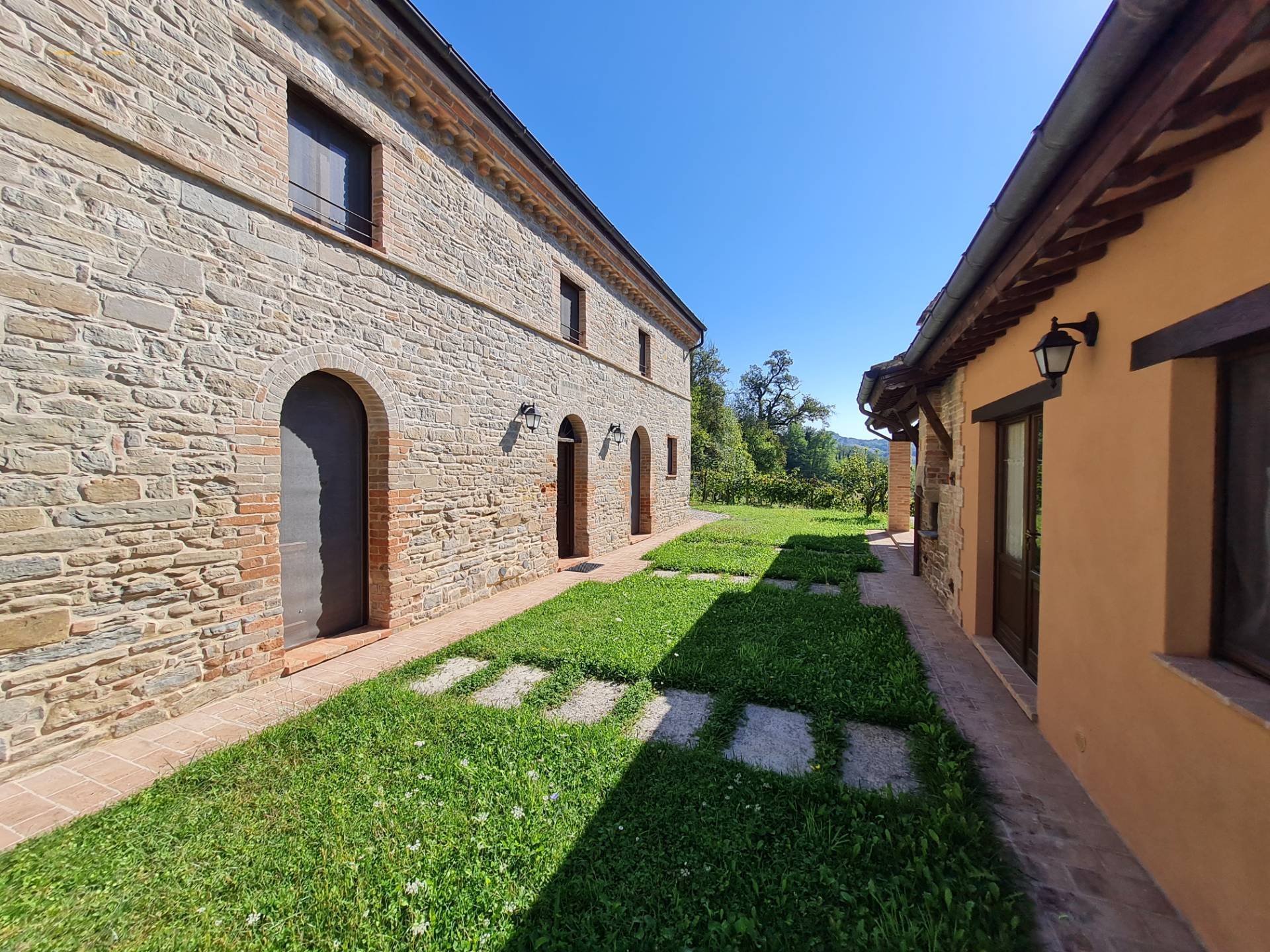 At the center of the property stands a majestic farmhouse dating back to around 1875, completely and expertly restored, maintaining the typical and traditional characteristics of this area. The exposed stone walls, the wooden ceilings and the wooden architraves on the windows, are really beautiful.