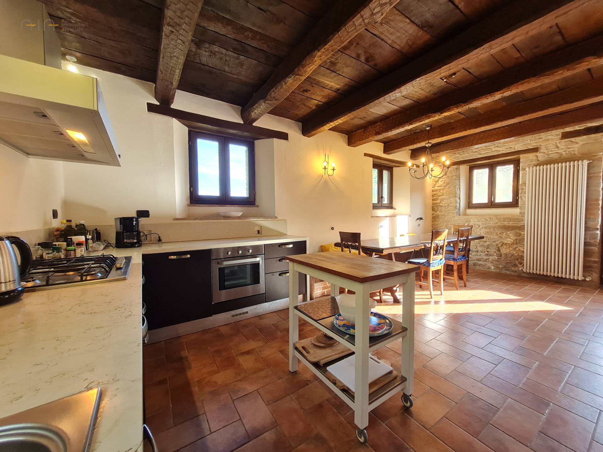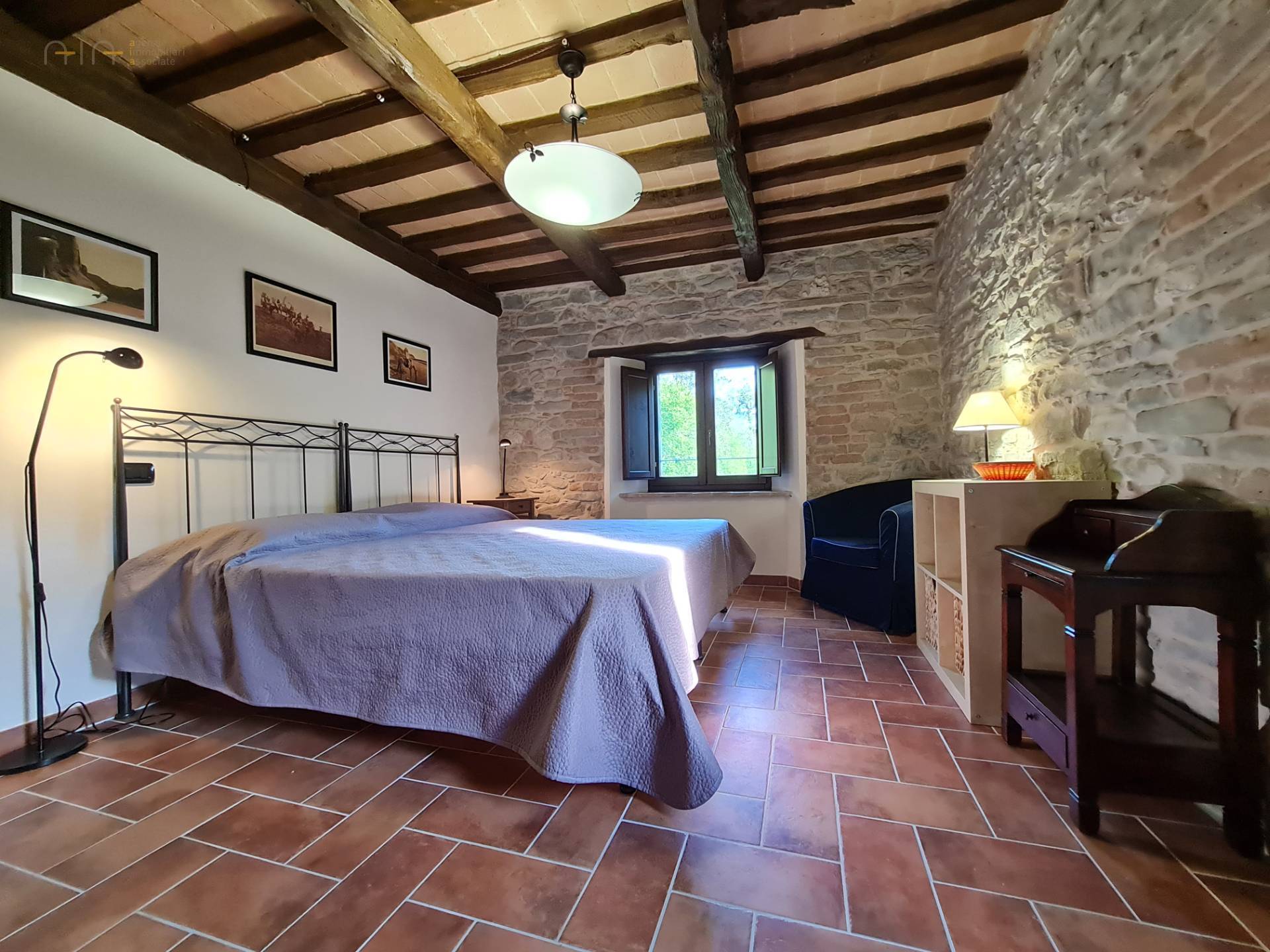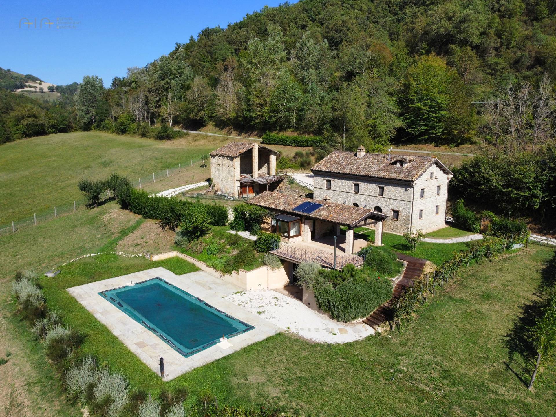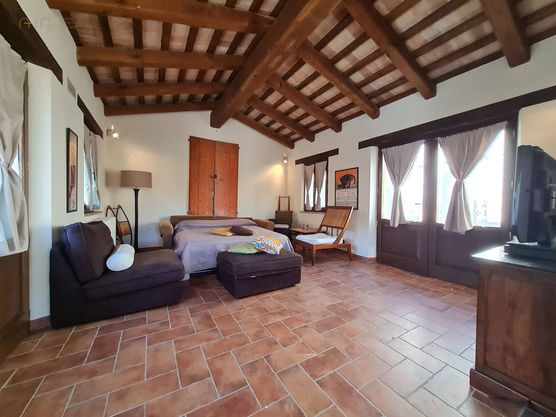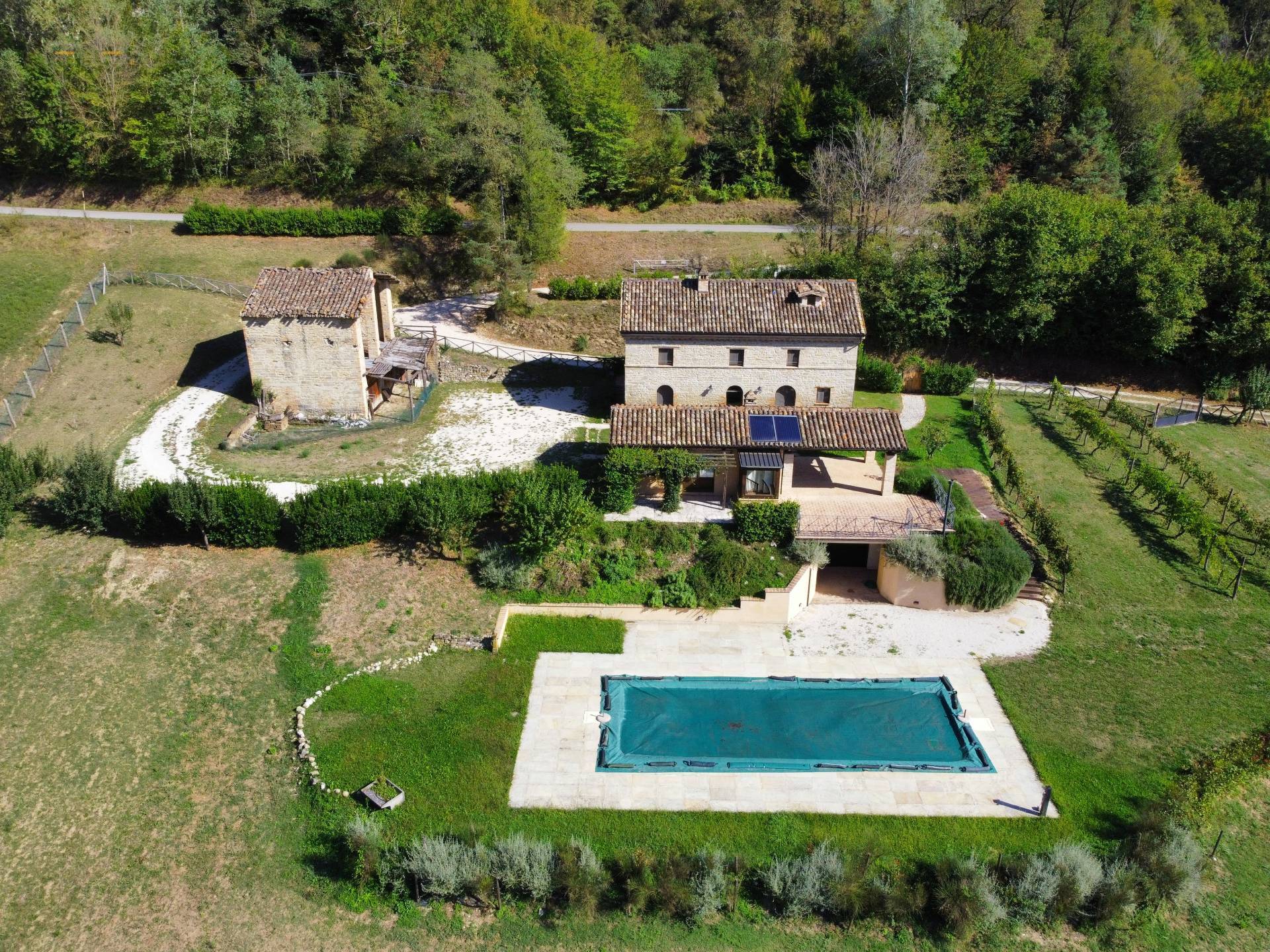 A few meters from the main house, a comfortable multipurpose annex has been renovated with bathroom, traditional oven, laundry, technical room for the swimming pool and large garage/storage room, as well as a beautiful porch with terrace. Note the solar panels on the roof used for the production of domestic hot water.
