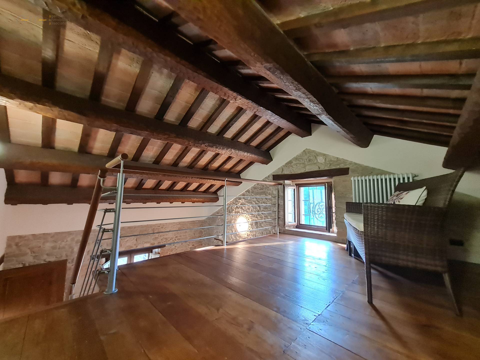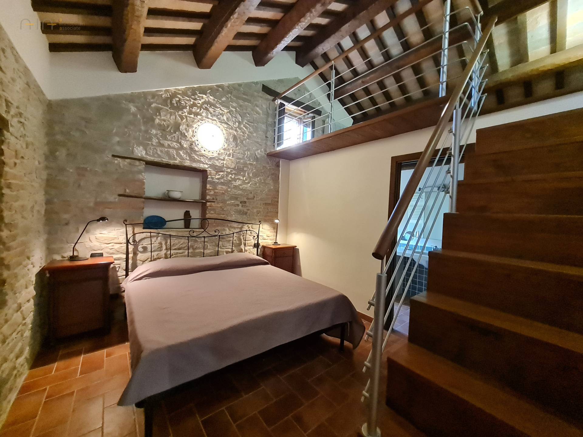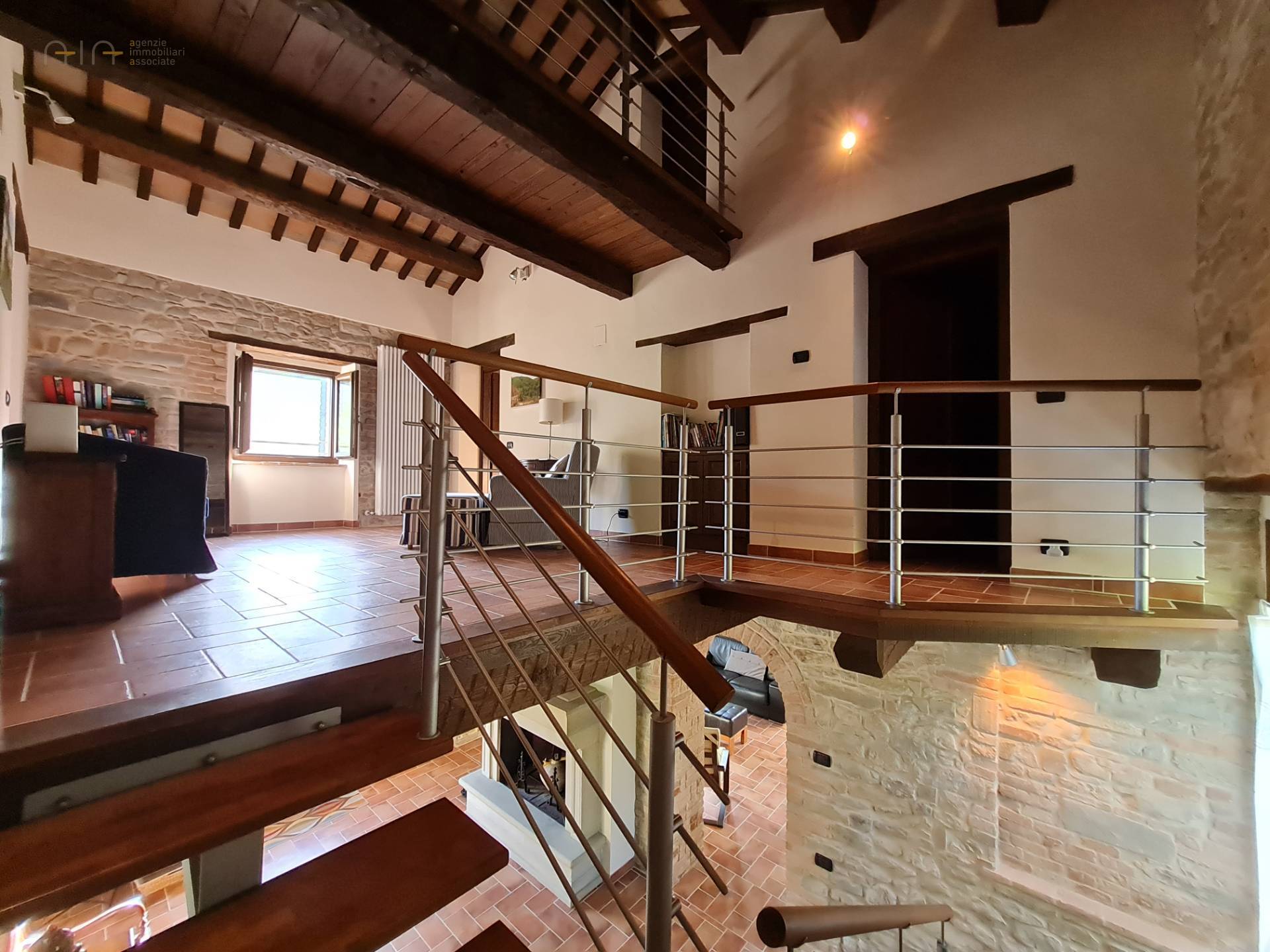 On the ground floor it has a large entrance hall with elegant stone fireplace, kitchen/living room, lounge and bathroom. Via a modern wooden and steel staircase you reach the living room on the first floor with a view of the mezzanine above.