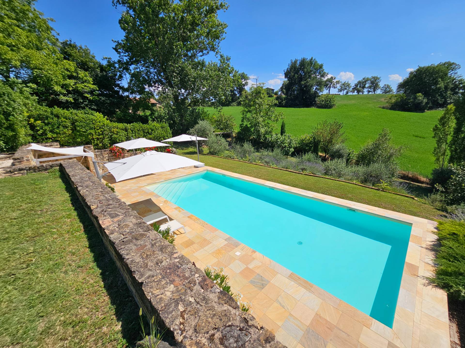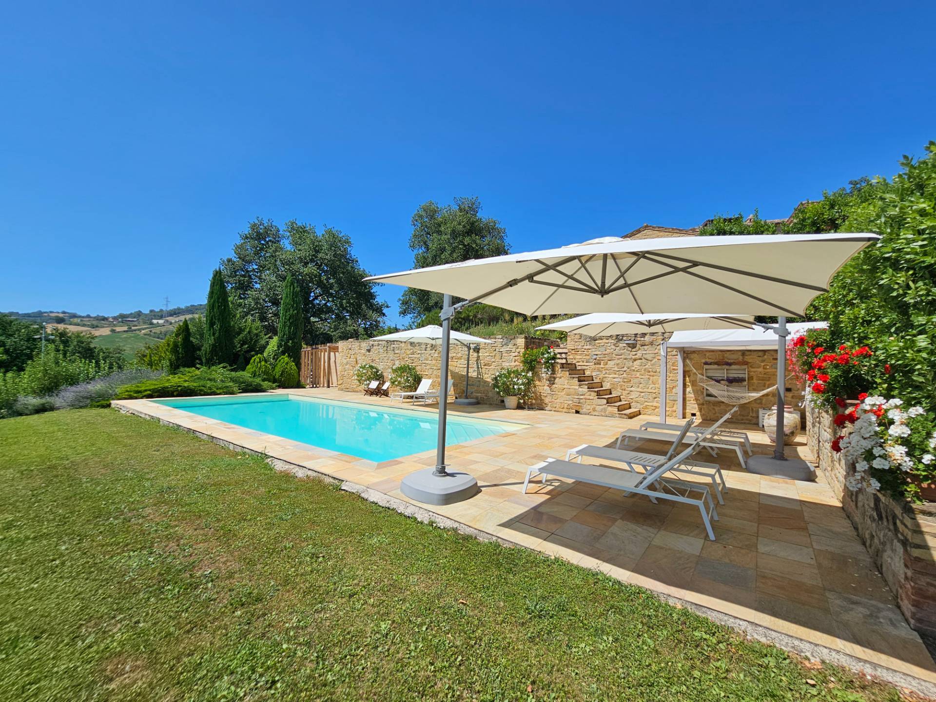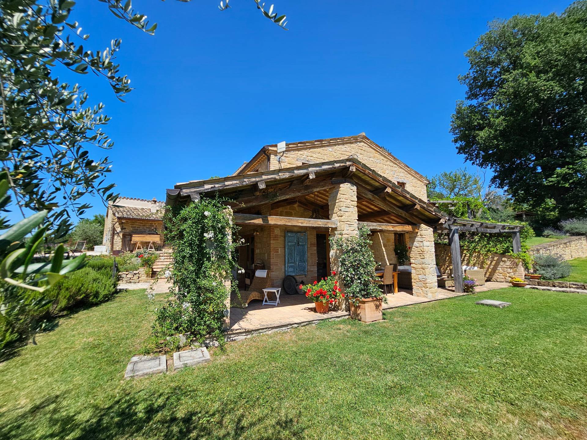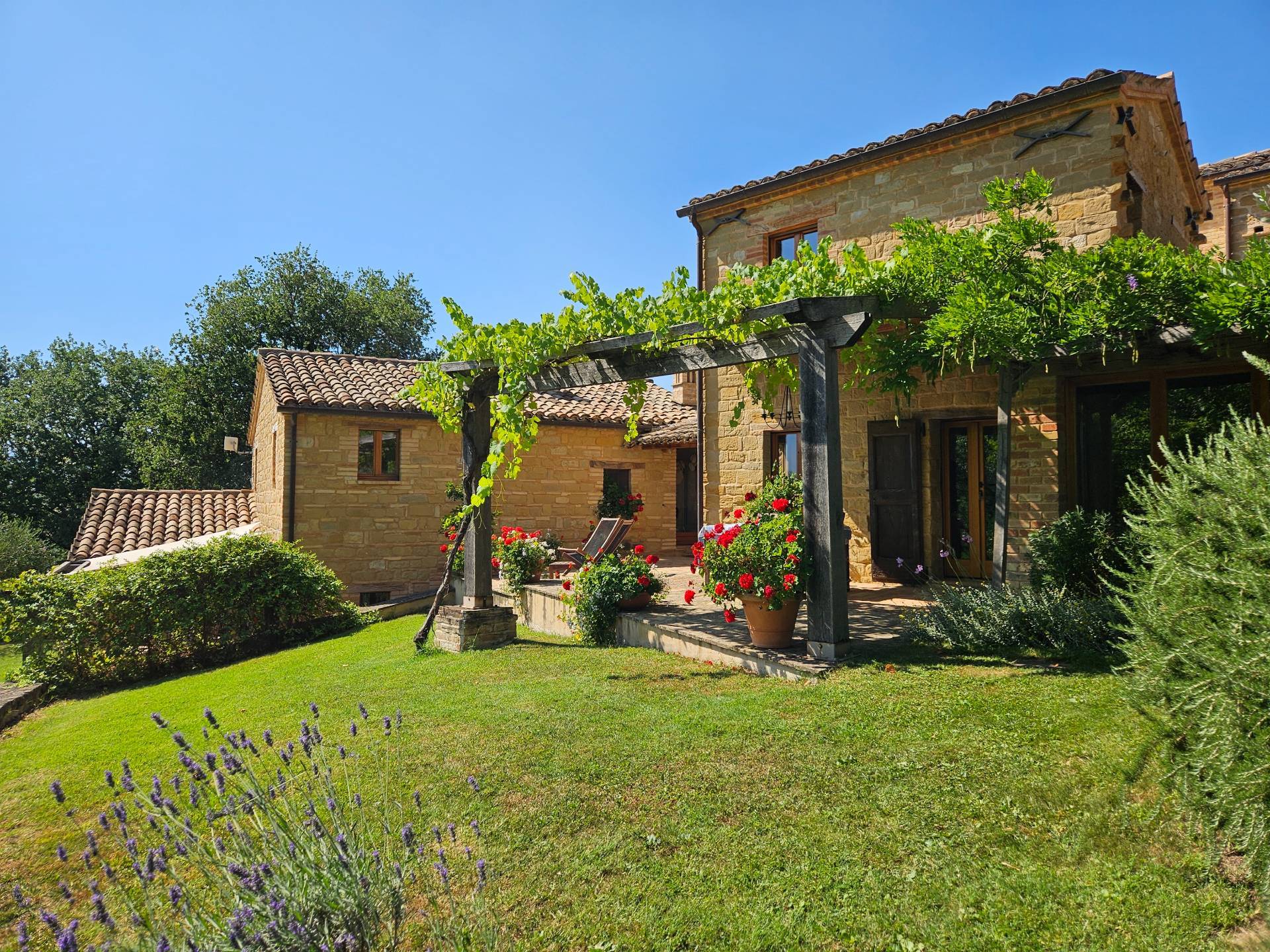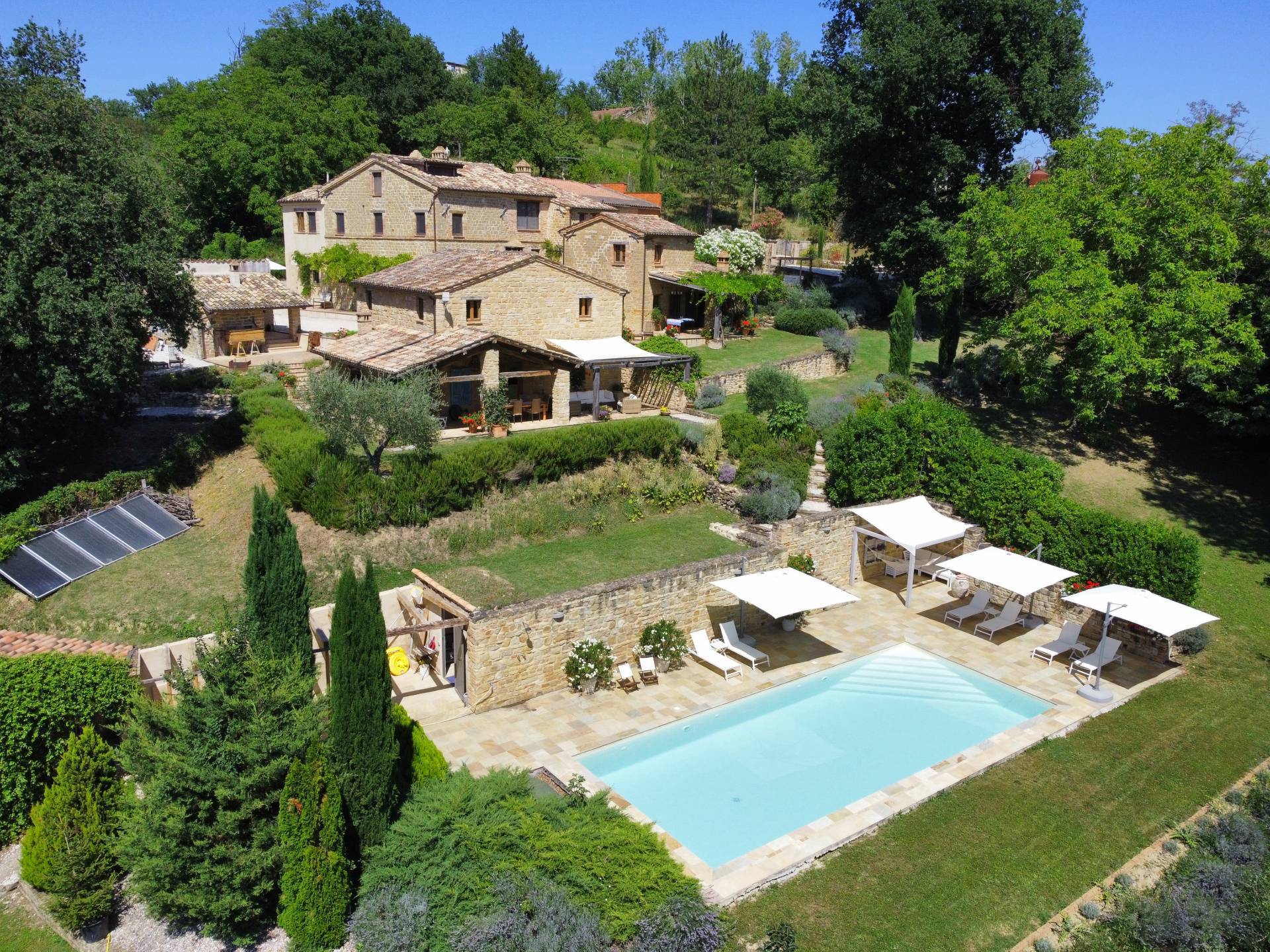 Nel cuore della meravigliosa campagna marchigiana, immerso in un lussureggiante giardino con piscina, incantevole casale ristrutturato con dependance per gli ospiti in Vendita.
