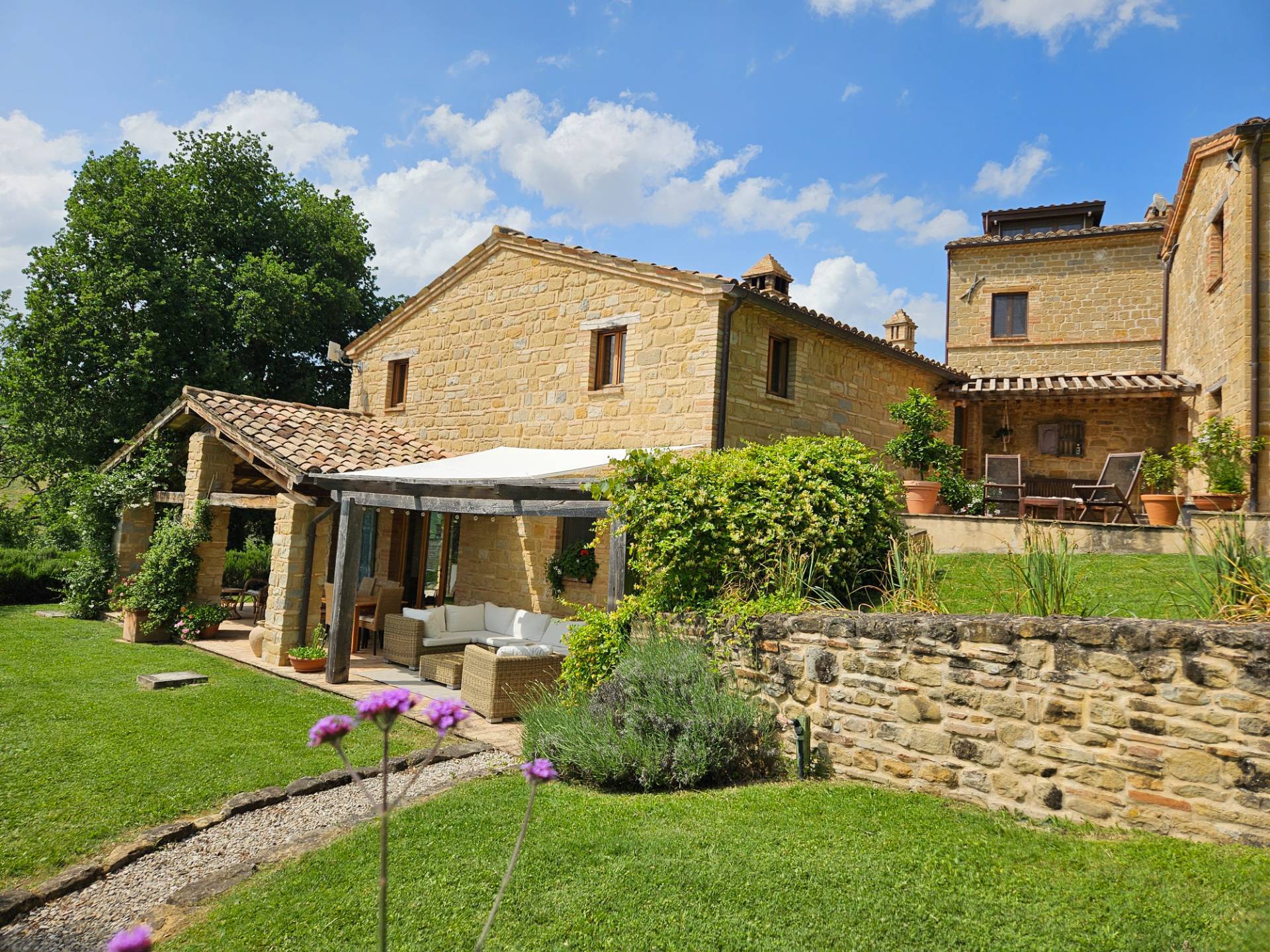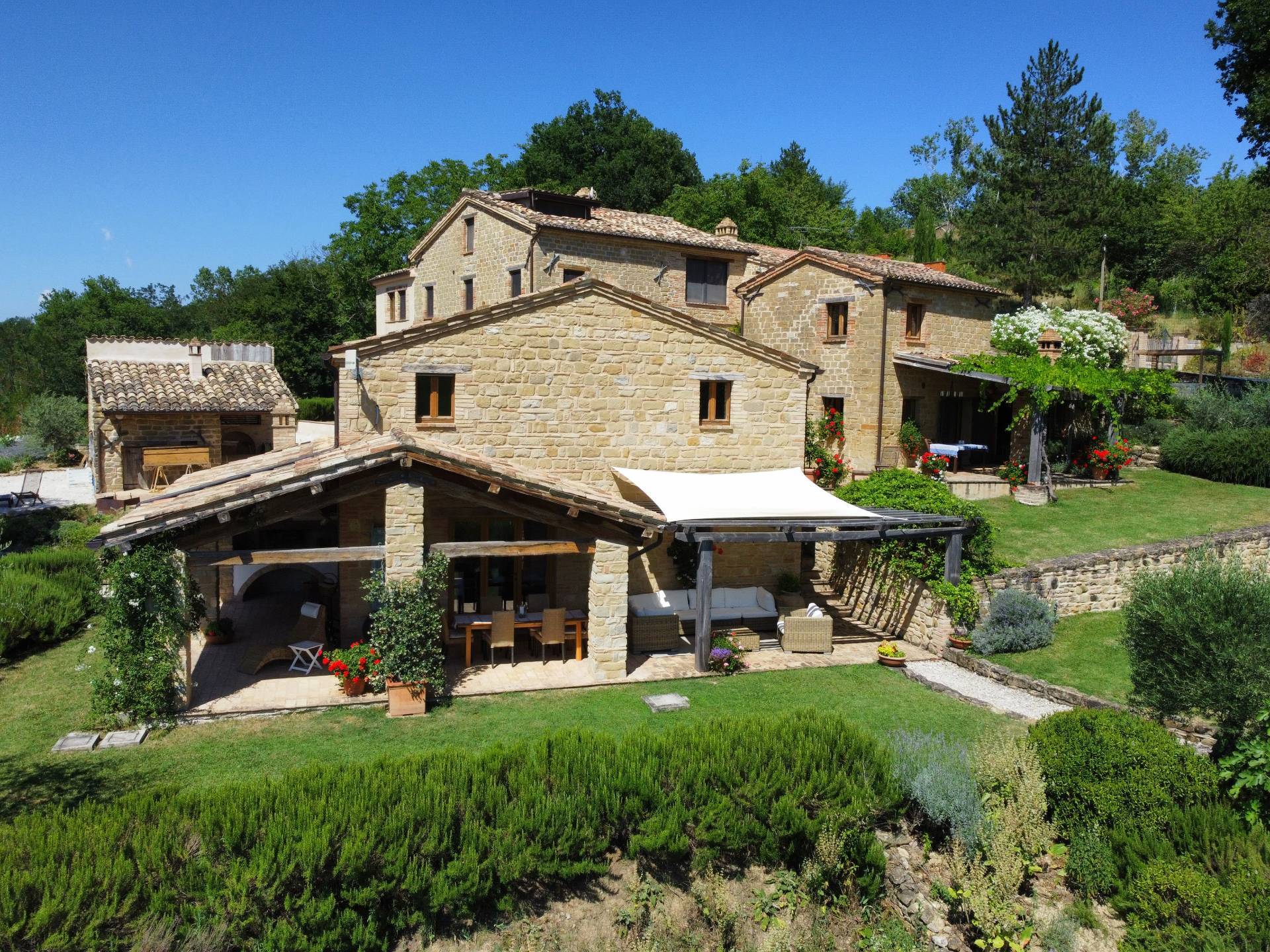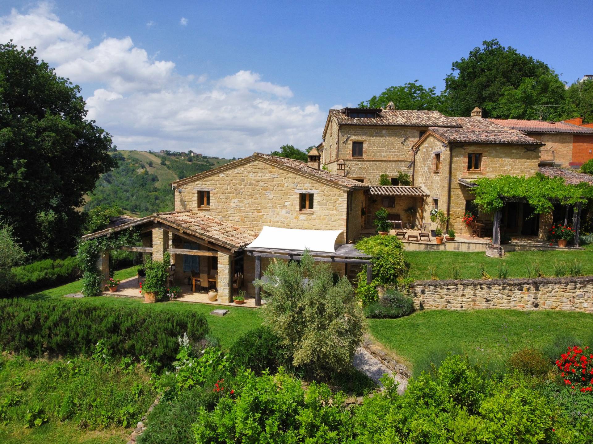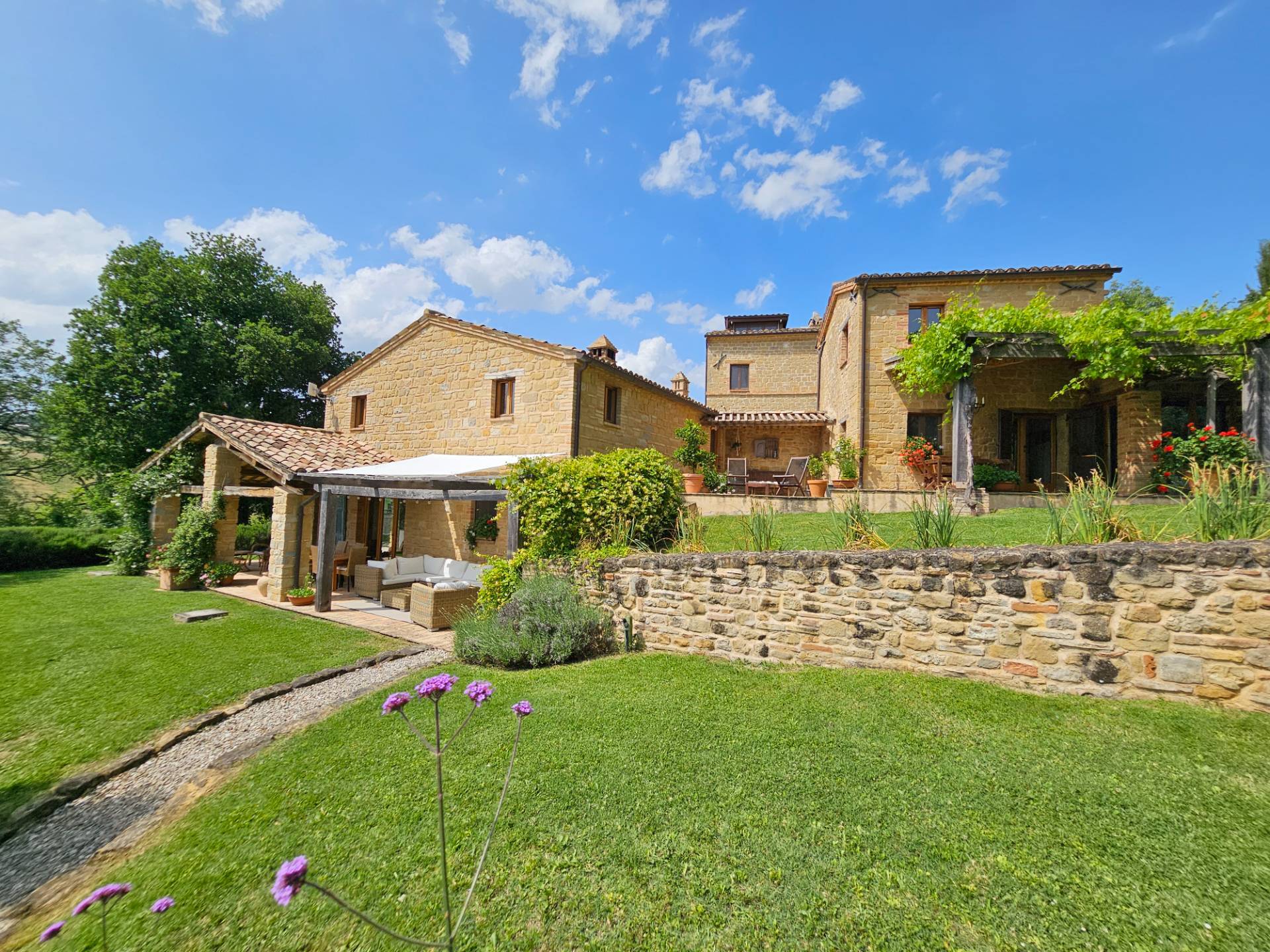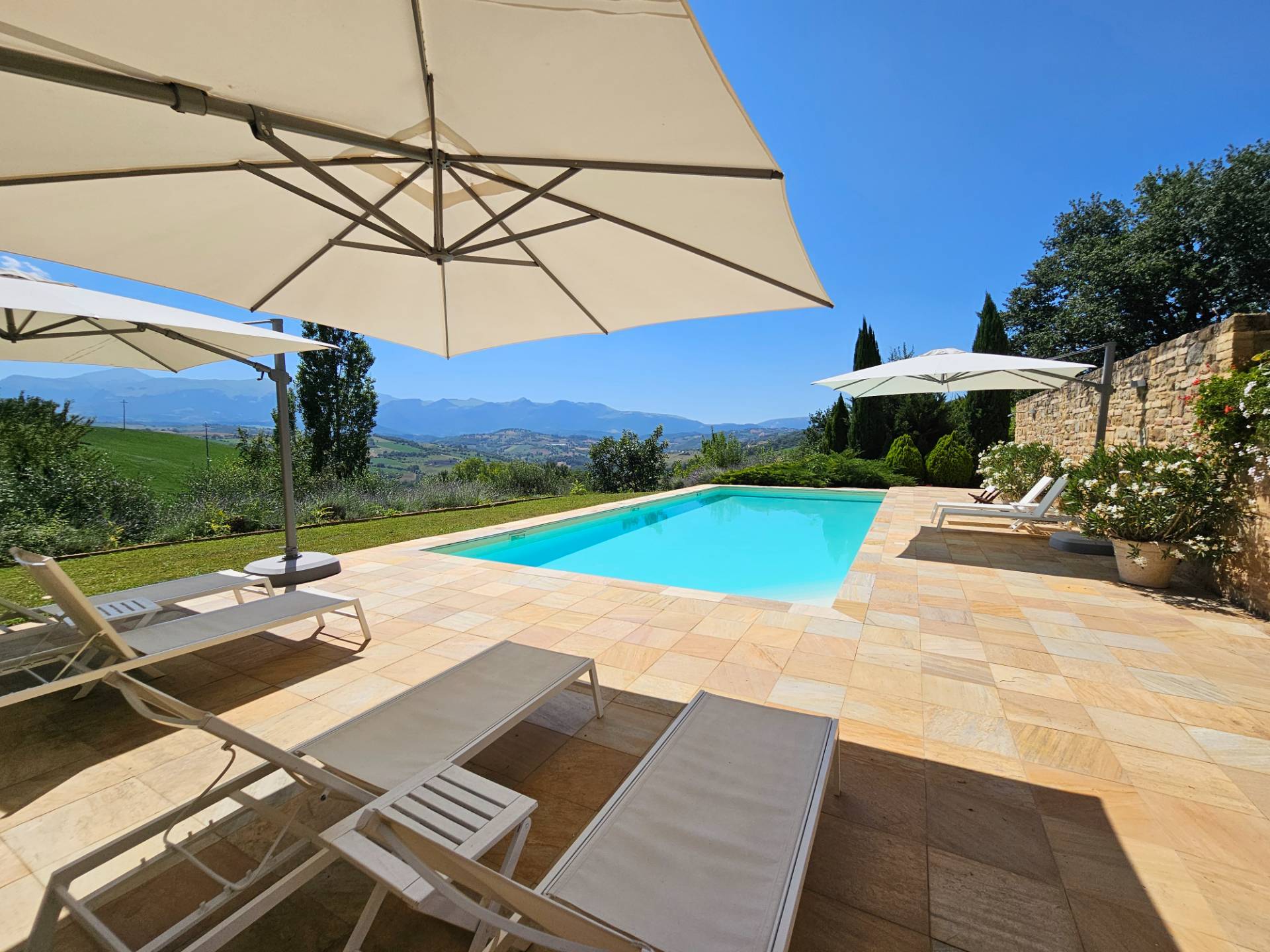 Nel cuore della meravigliosa campagna marchigiana, immerso in un lussureggiante giardino con piscina, incantevole casale ristrutturato con dependance per gli ospiti in Vendita.