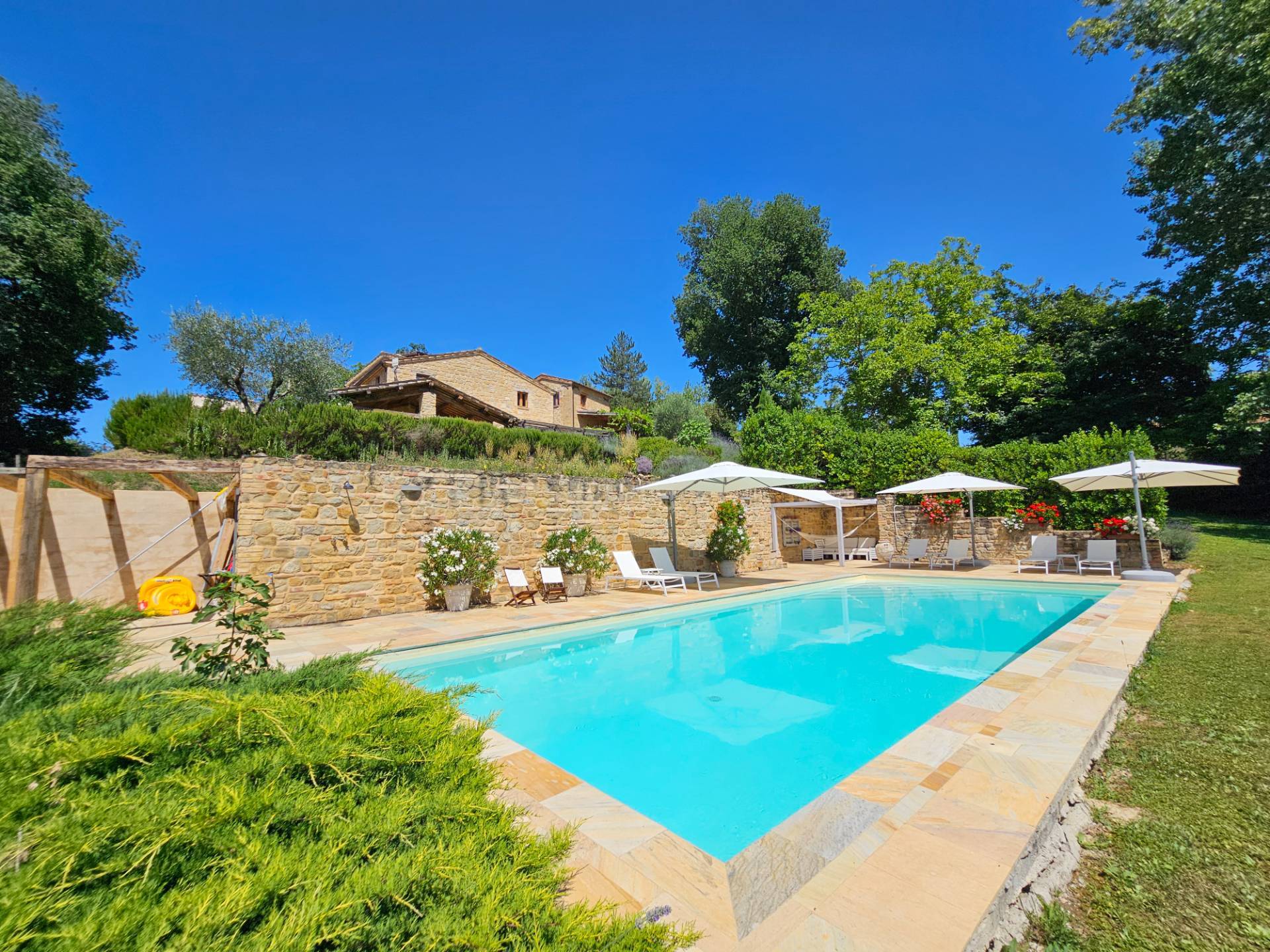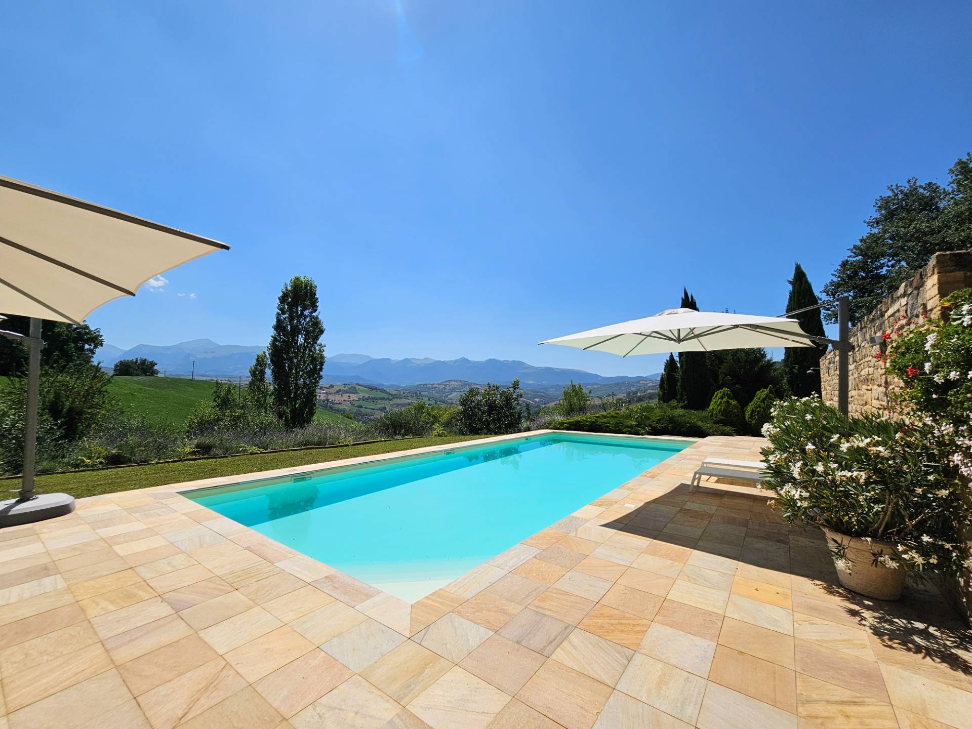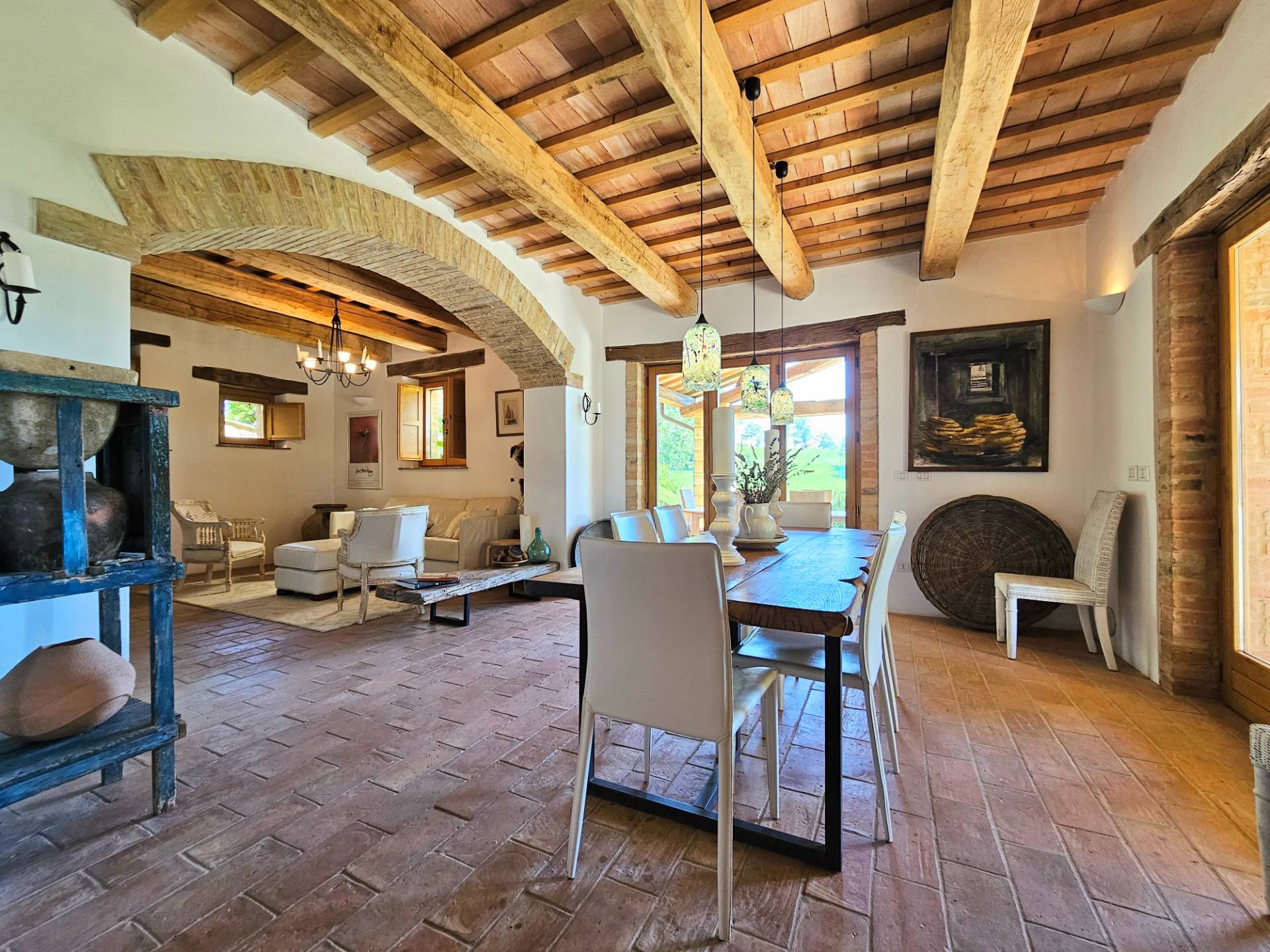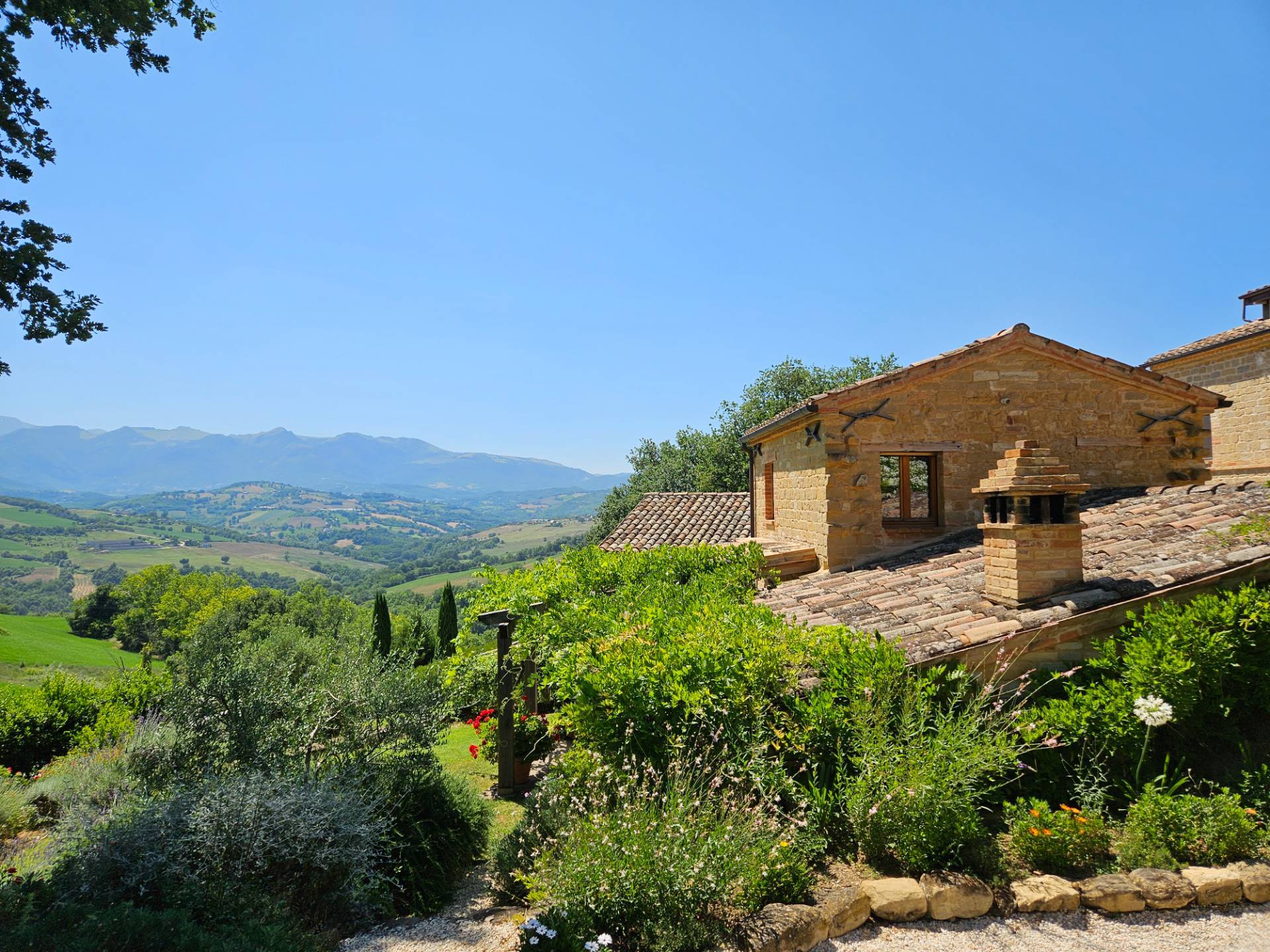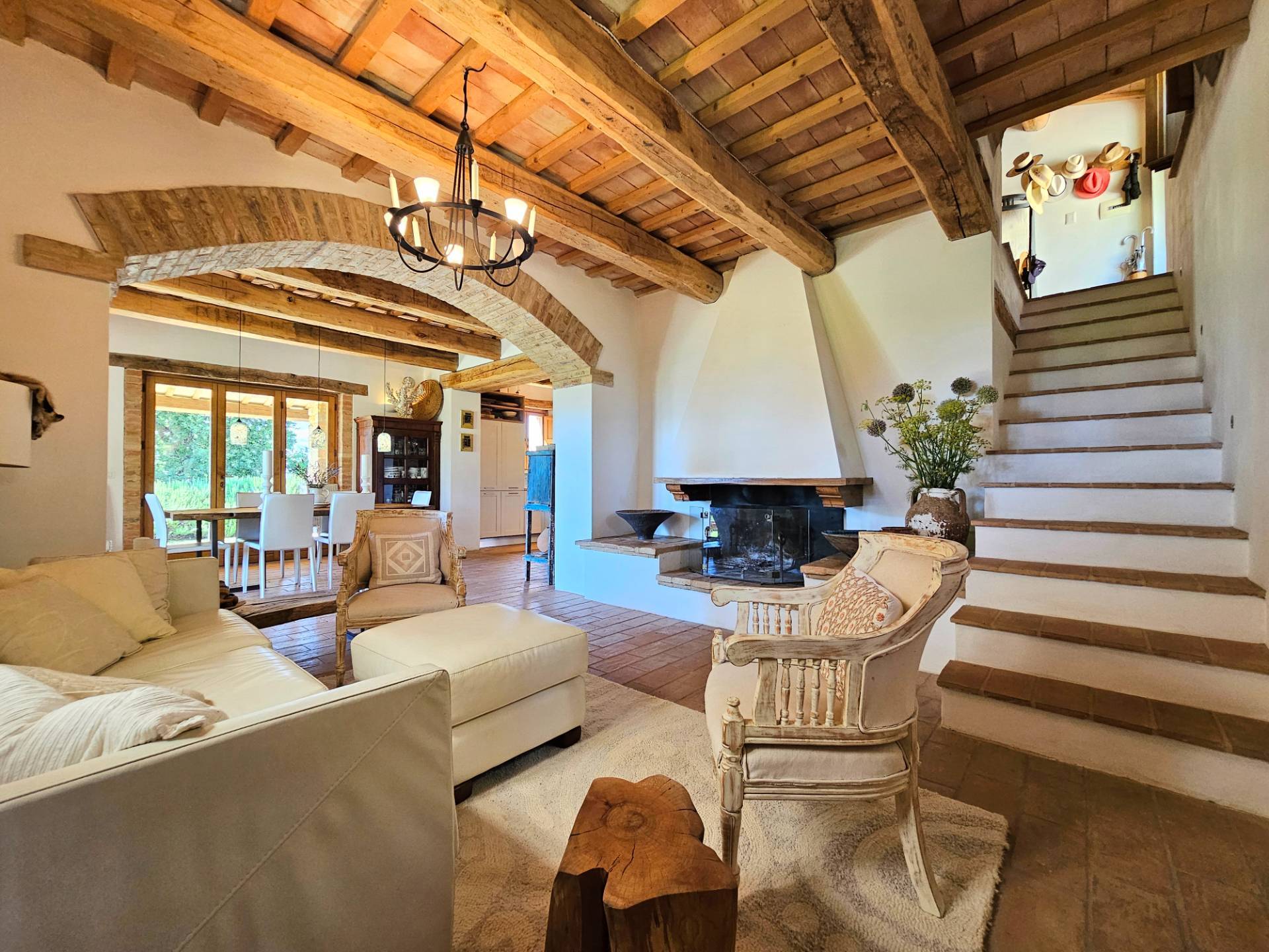 Nel cuore della meravigliosa campagna marchigiana, immerso in un lussureggiante giardino con piscina, incantevole casale ristrutturato con dependance per gli ospiti in Vendita.