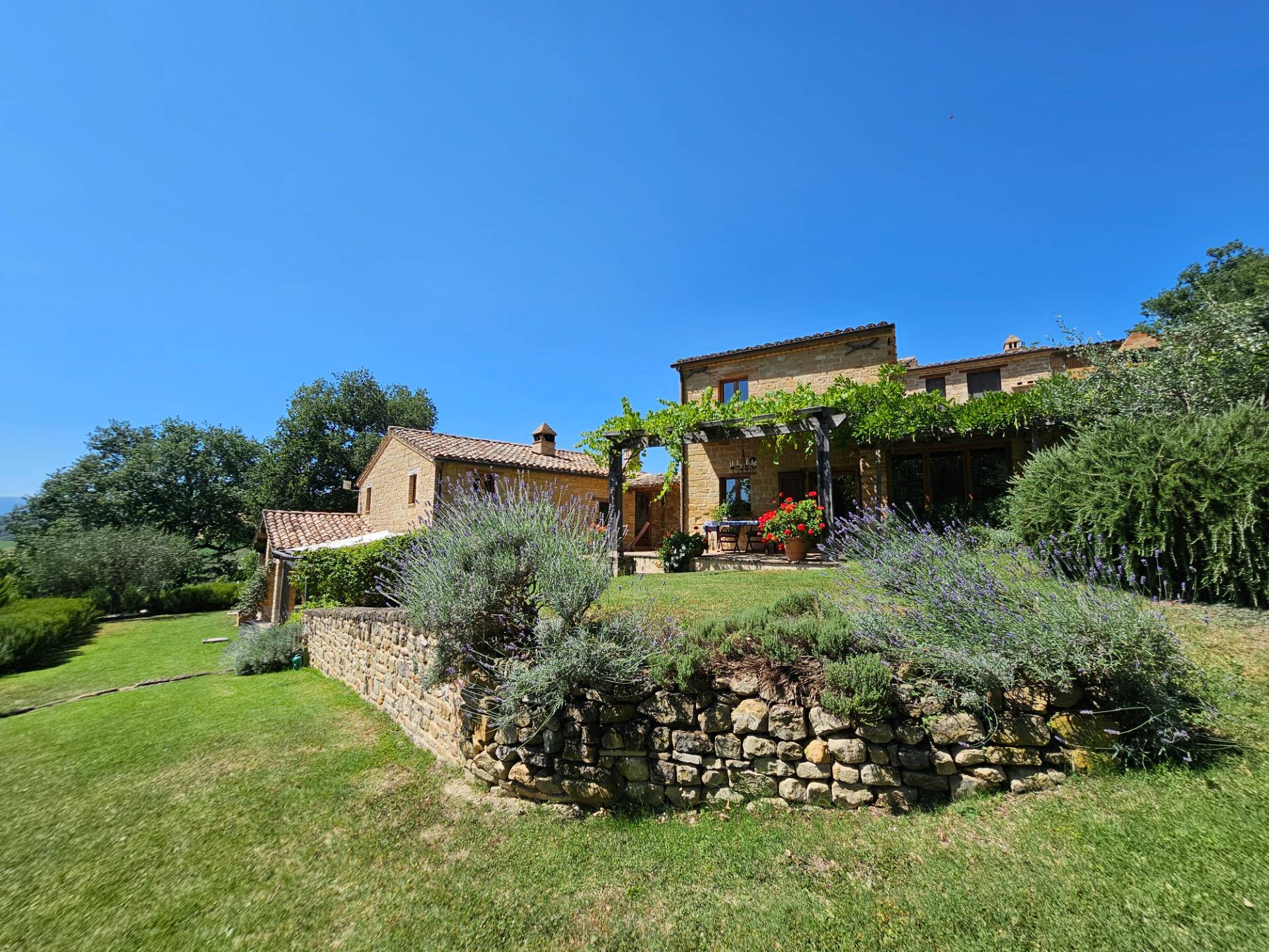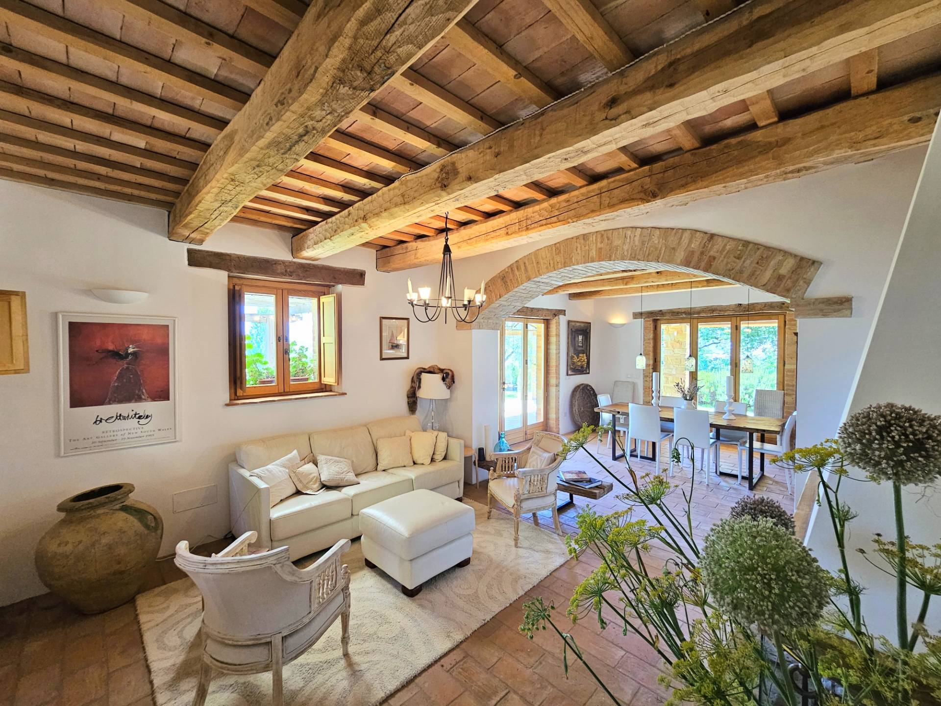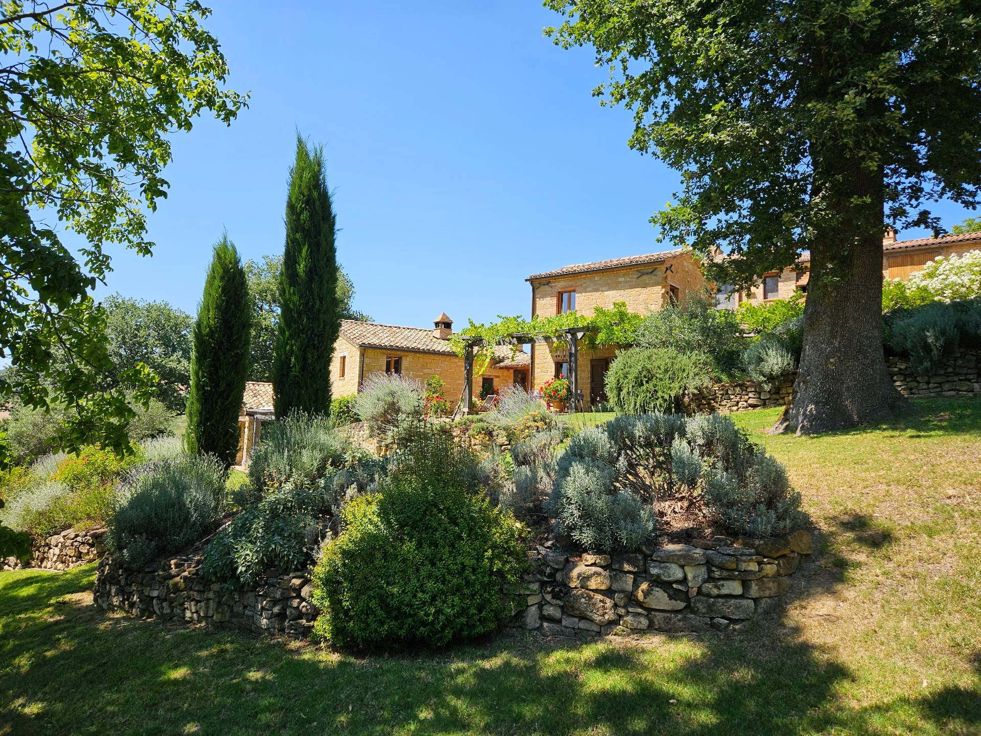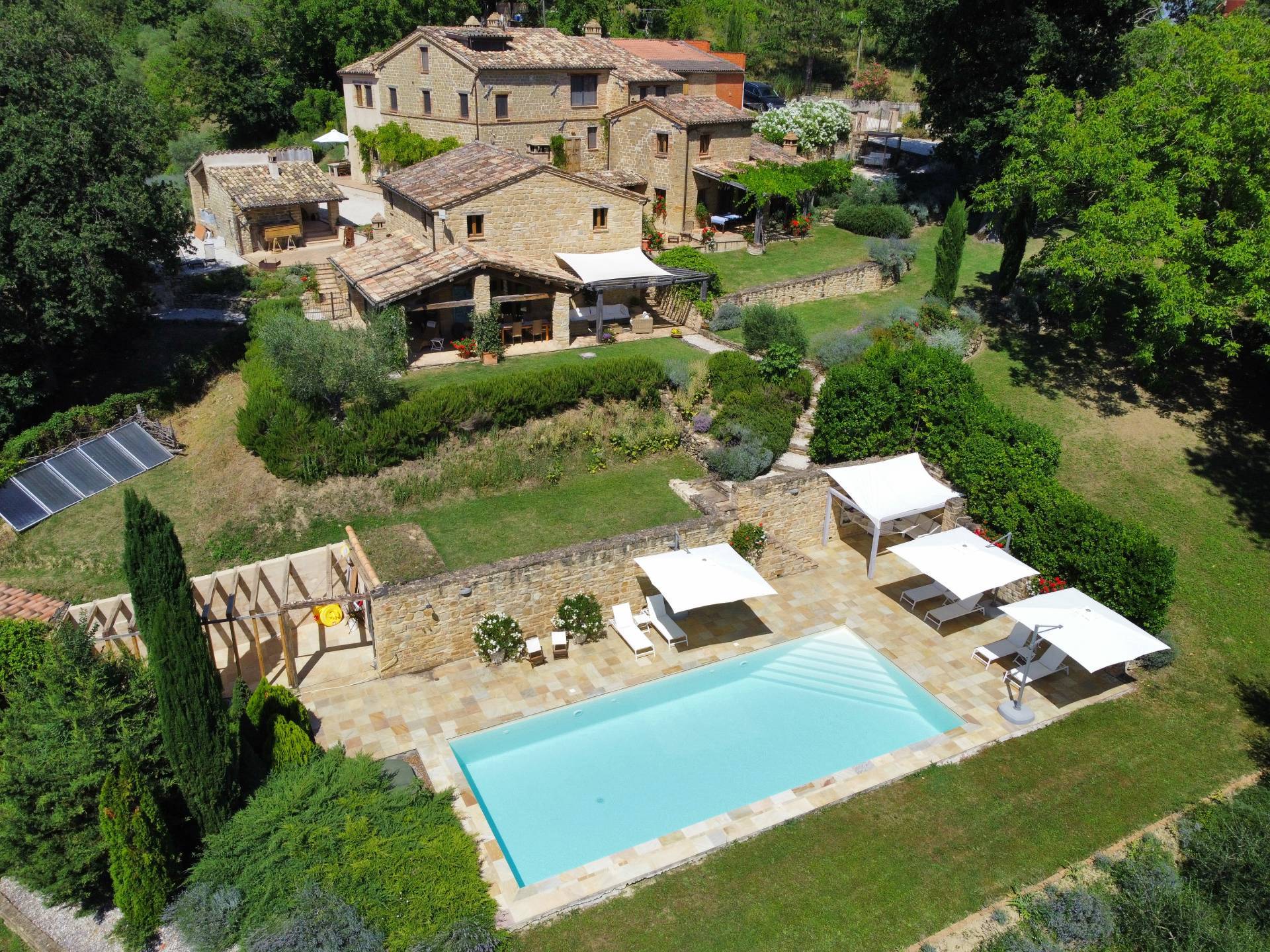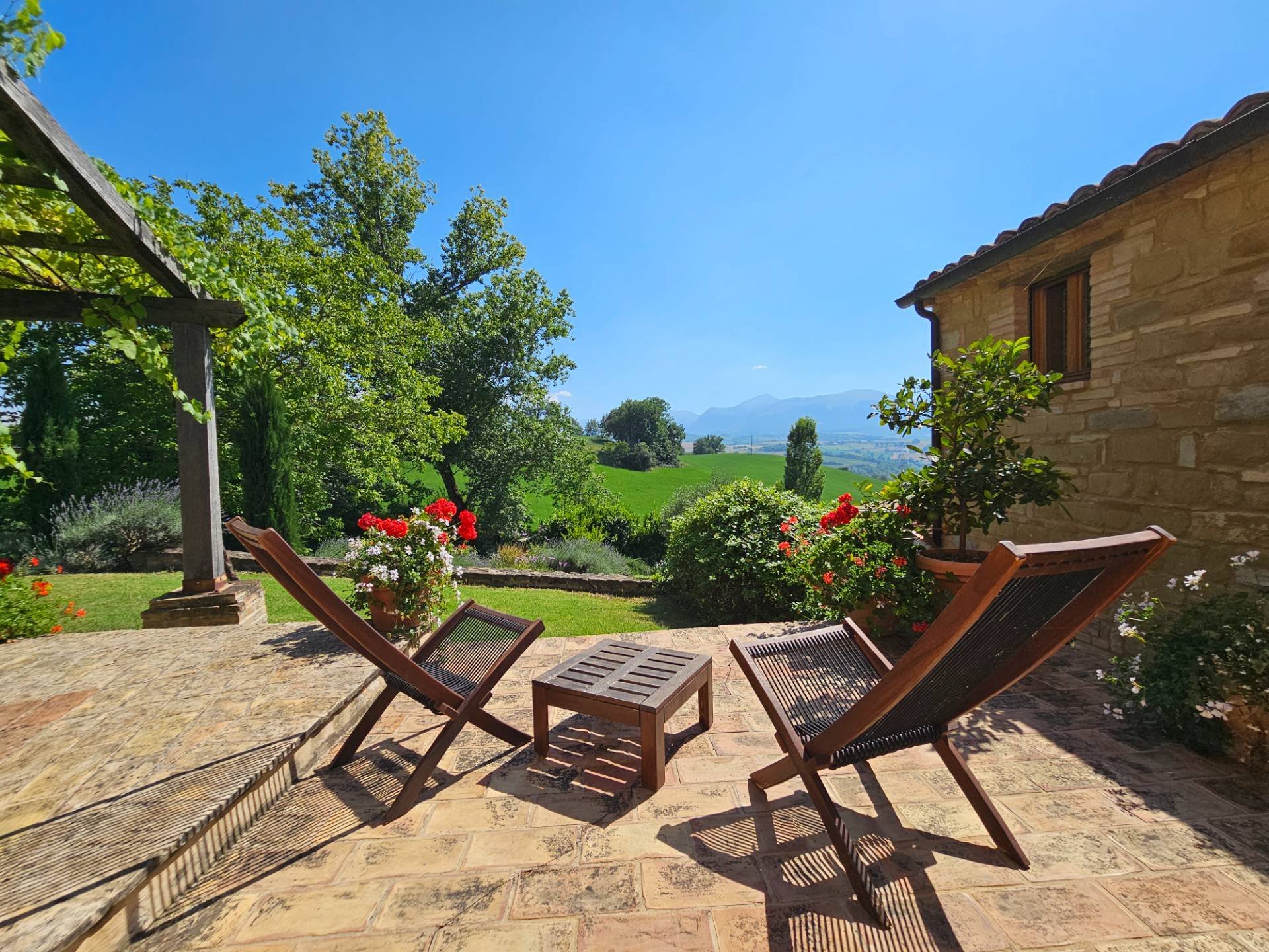 Nel cuore della meravigliosa campagna marchigiana, immerso in un lussureggiante giardino con piscina, incantevole casale ristrutturato con dependance per gli ospiti in Vendita.
