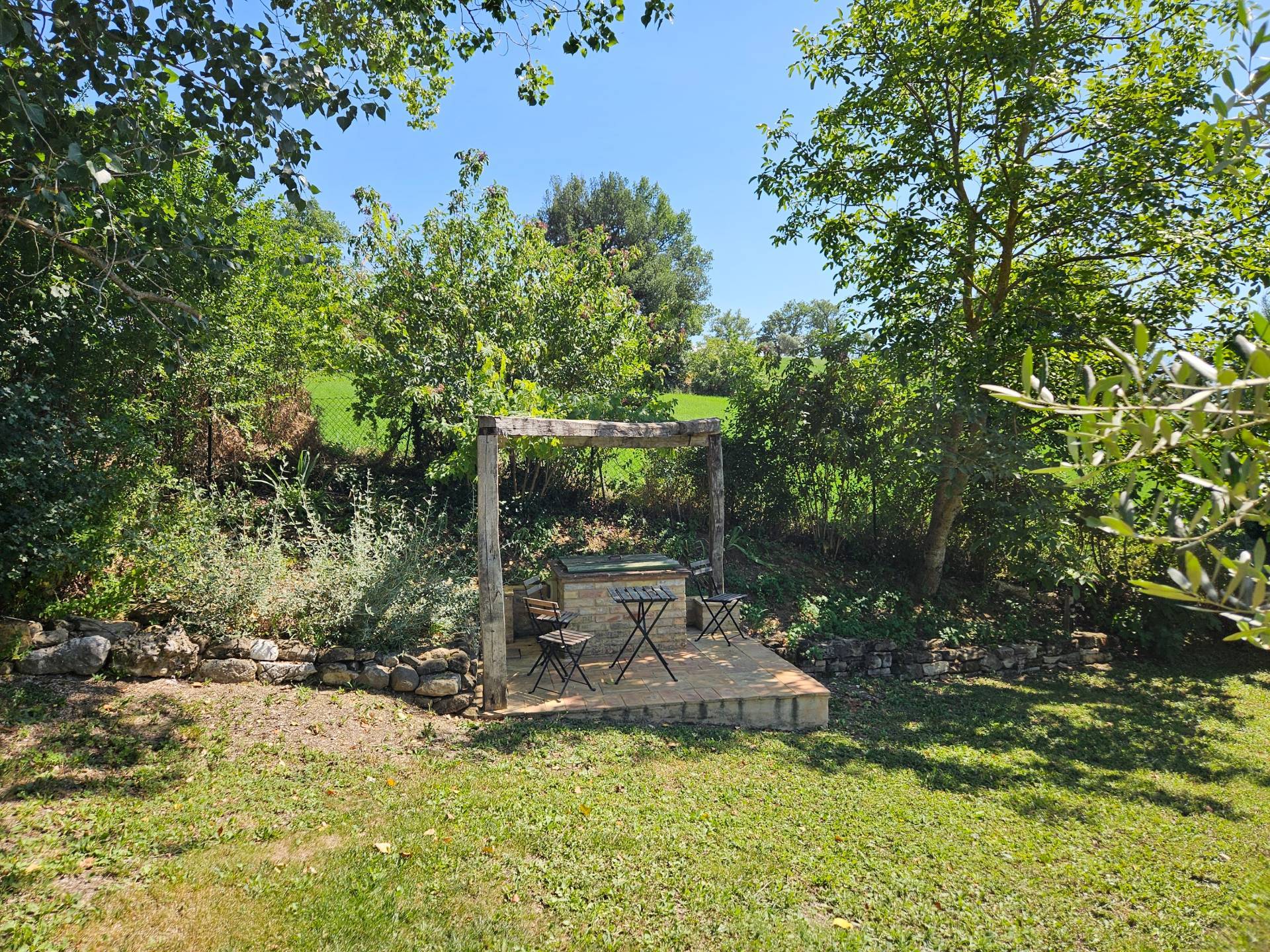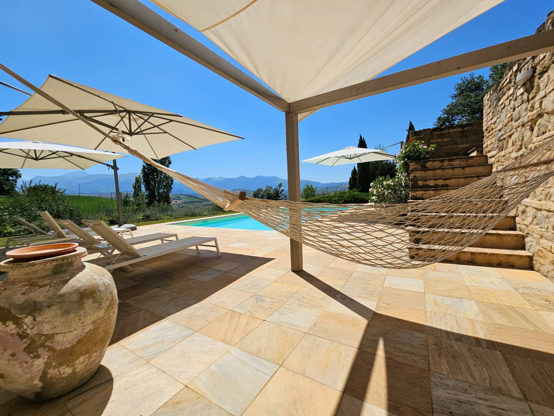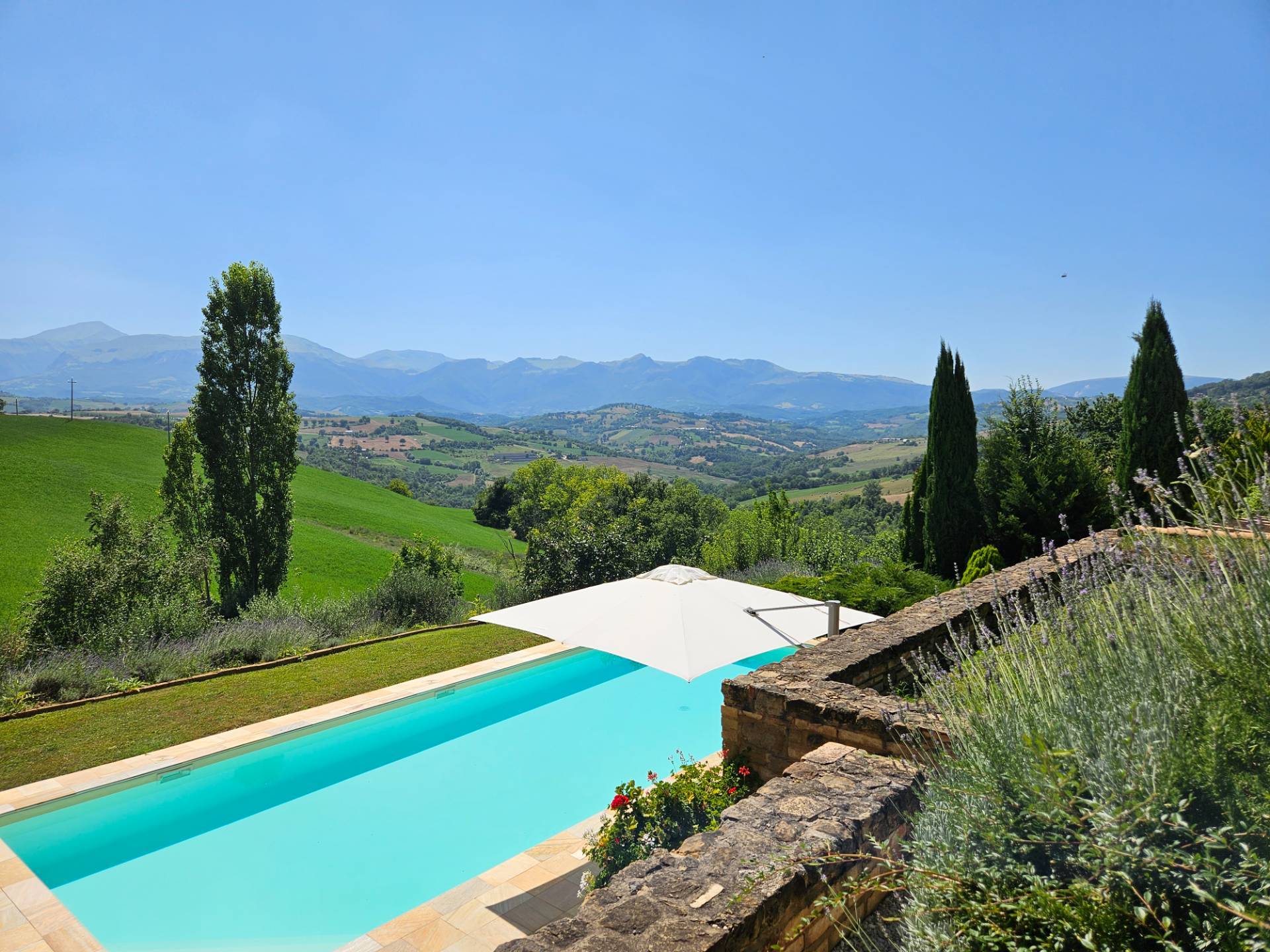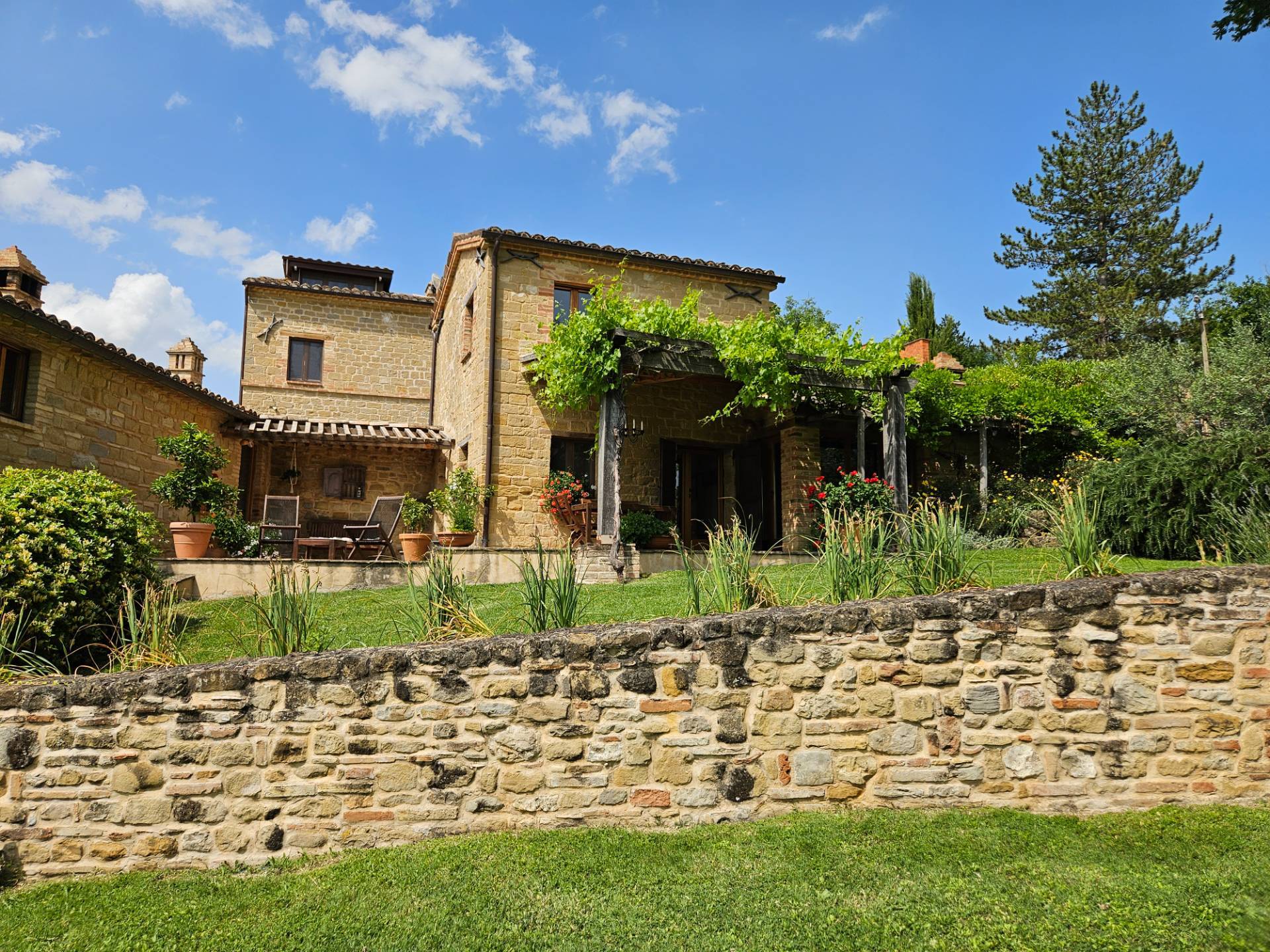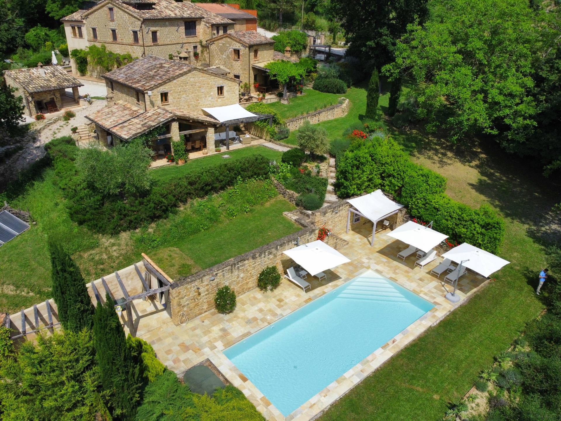 Nel cuore della meravigliosa campagna marchigiana, immerso in un lussureggiante giardino con piscina, incantevole casale ristrutturato con dependance per gli ospiti in Vendita.
