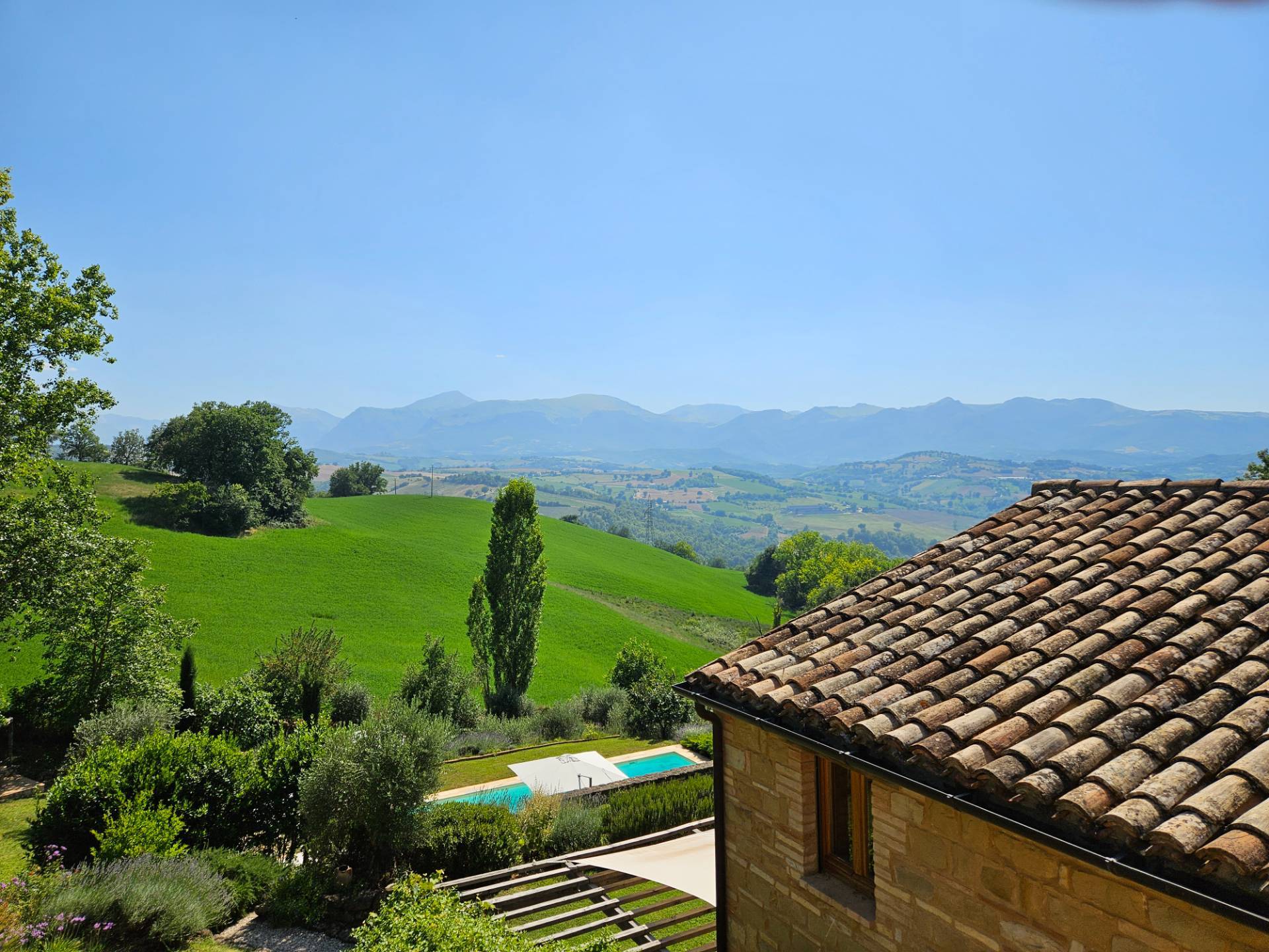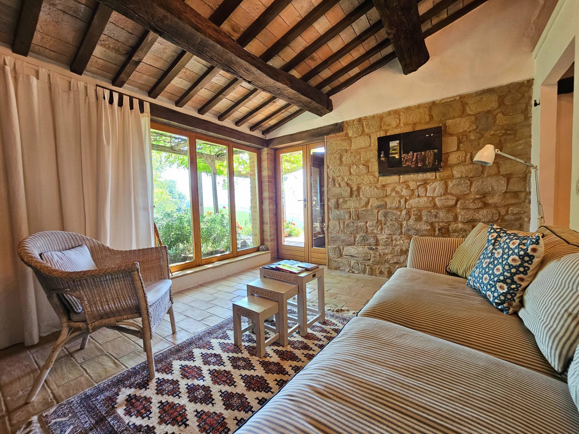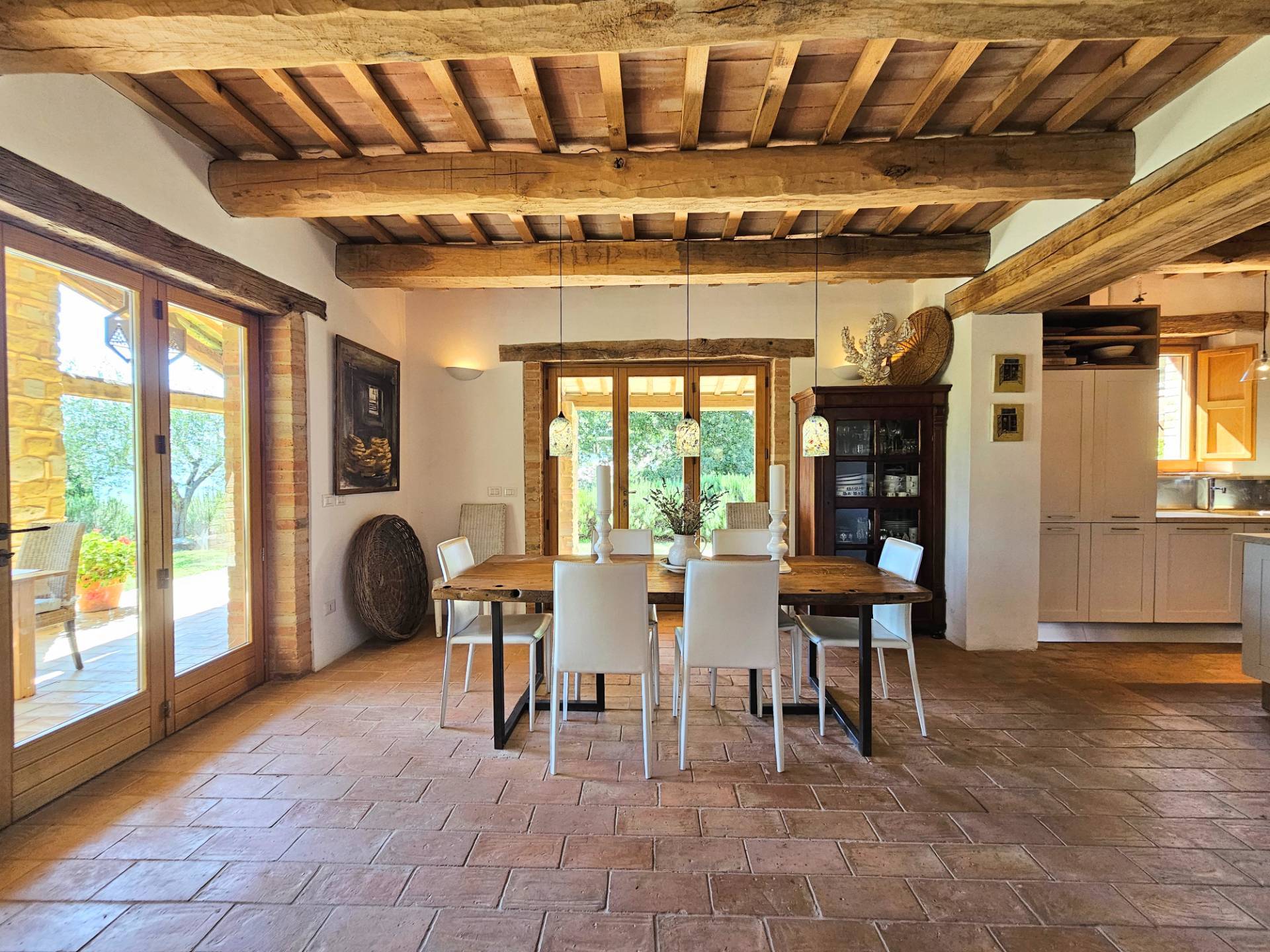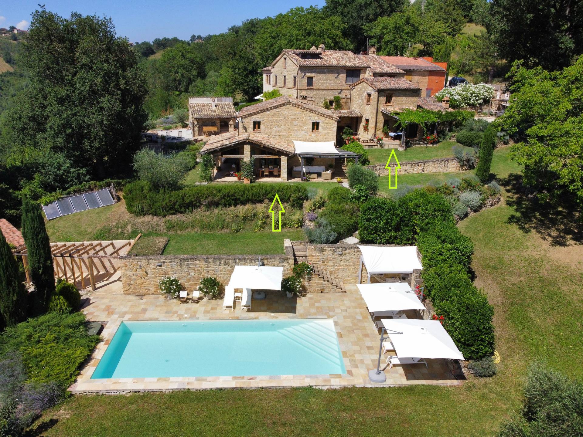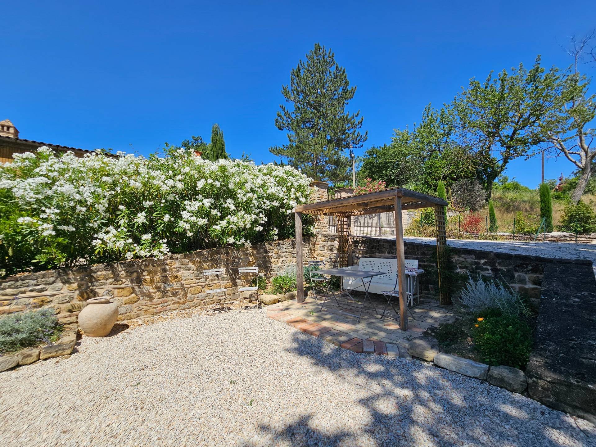 Nel cuore della meravigliosa campagna marchigiana, immerso in un lussureggiante giardino con piscina, incantevole casale ristrutturato con dependance per gli ospiti in Vendita.