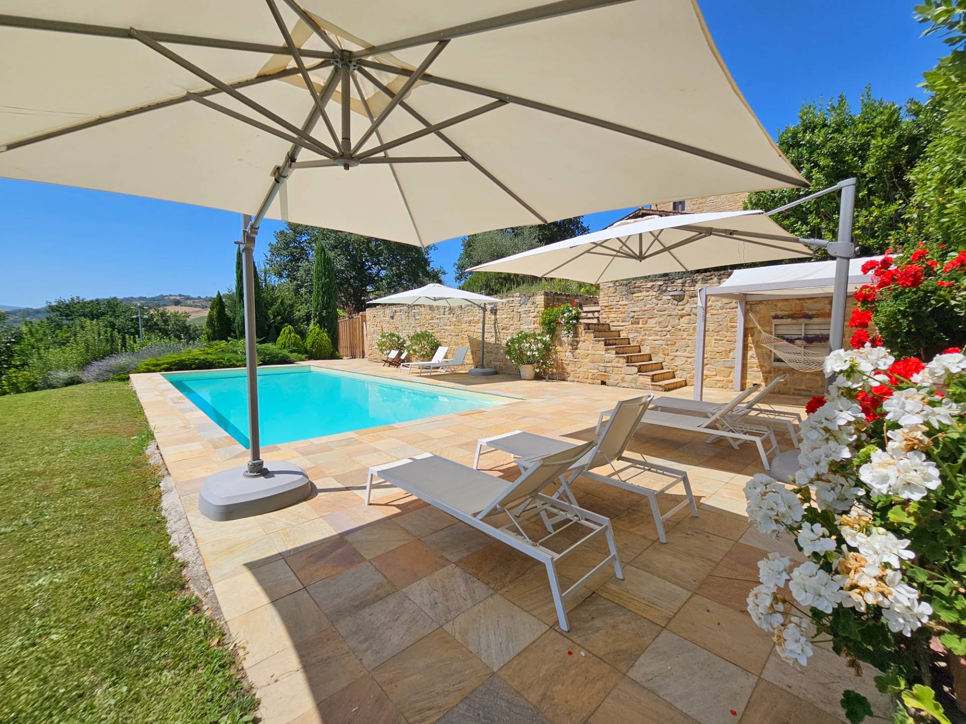 Passeggiando troverete numerosi angoli ricchi di fiori dove potersi rilassare, sedersi sotto l'ombra di una quercia secolare, oppure fare un tuffo nella bellissima piscina 12.00x5.00mt e poi stendersi su un lettino prendisole e godere di un panorama unico.