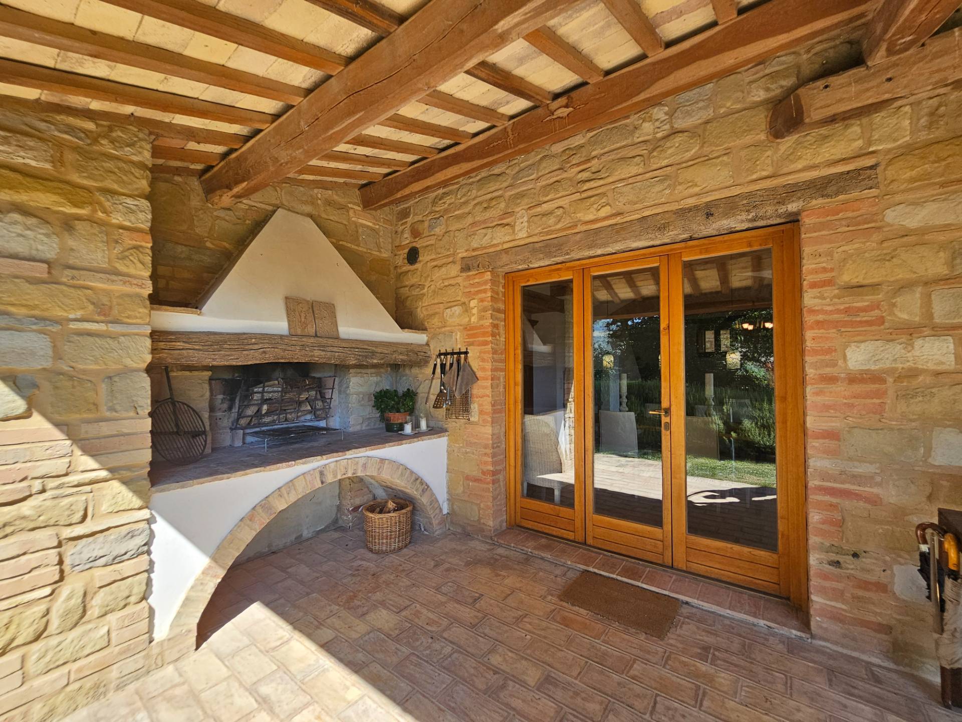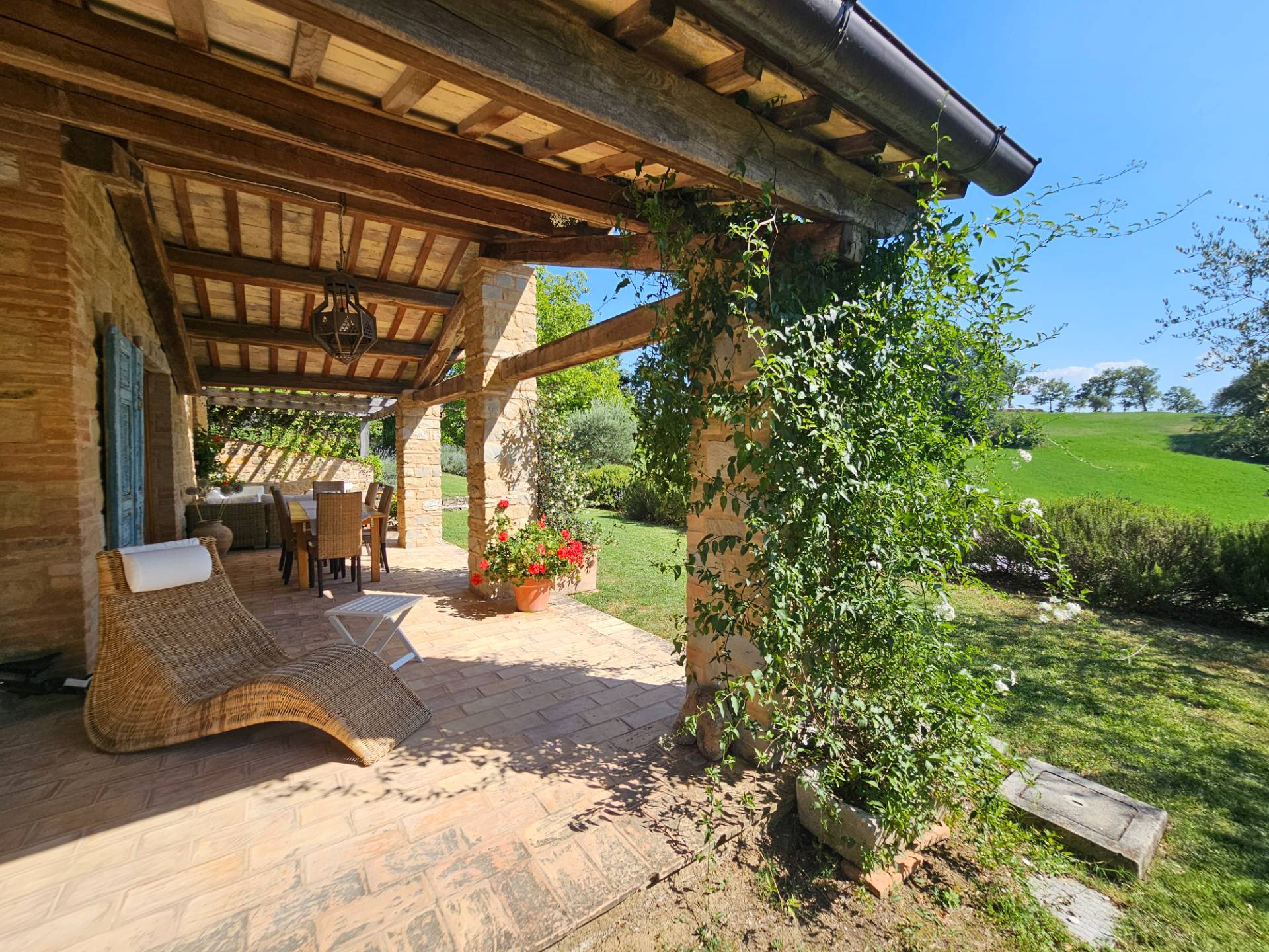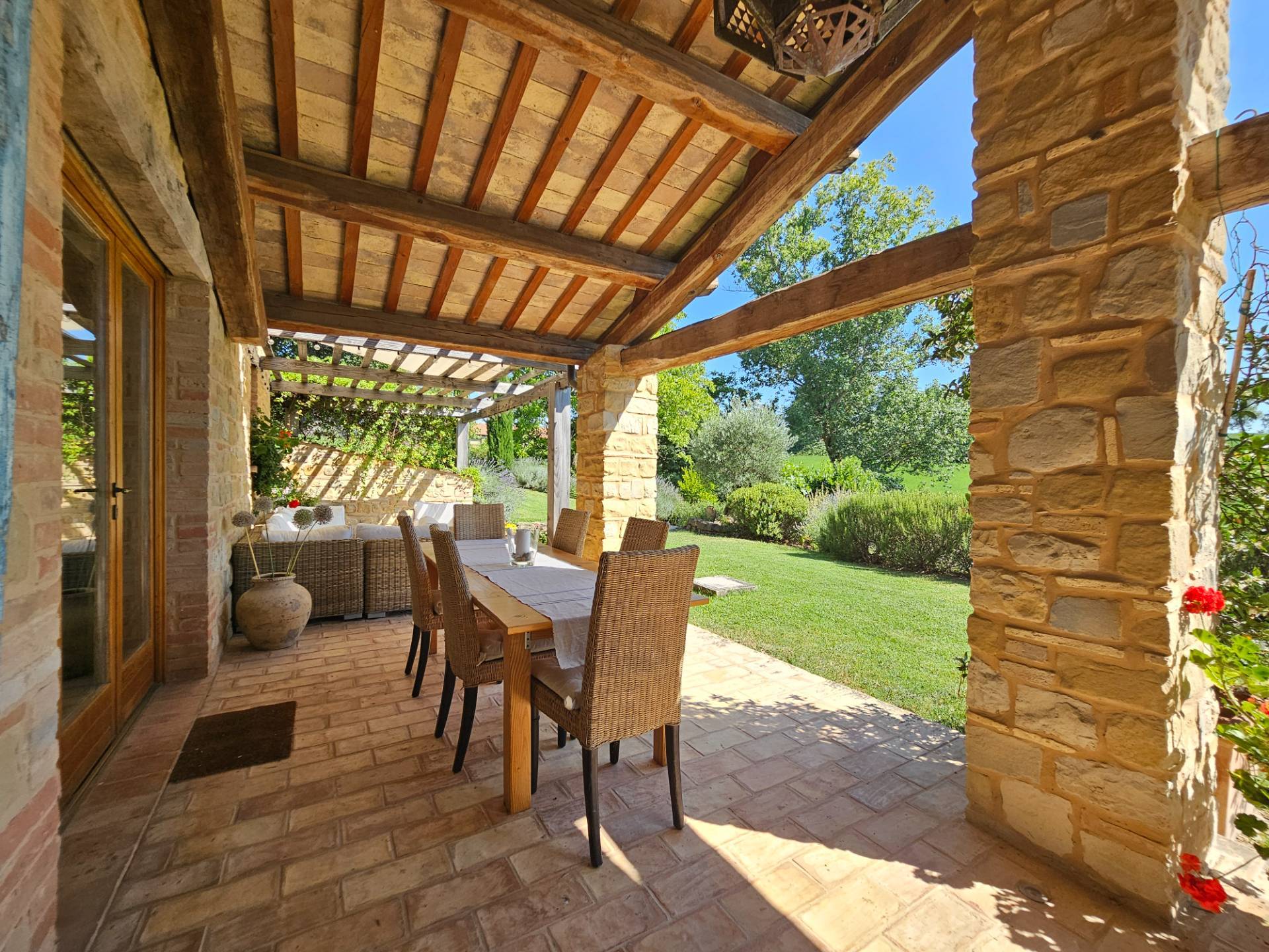 Esternamente il casale è dotato di un grande caratteristico portico con angolo BBQ ed un pergolato in legno, arredati con eleganti tavoli e sedie e comodi divani da cui poter contemplare il panorama.