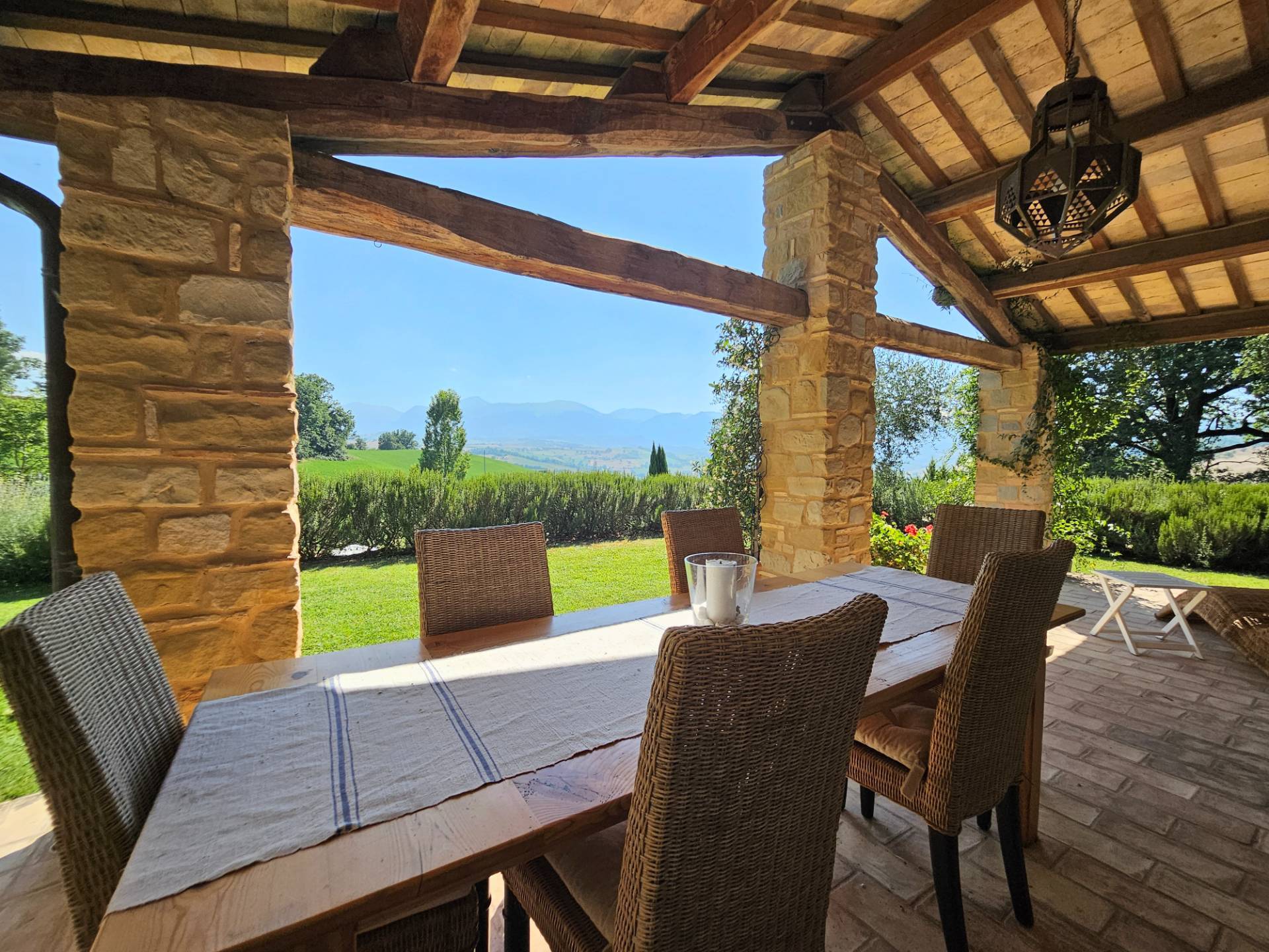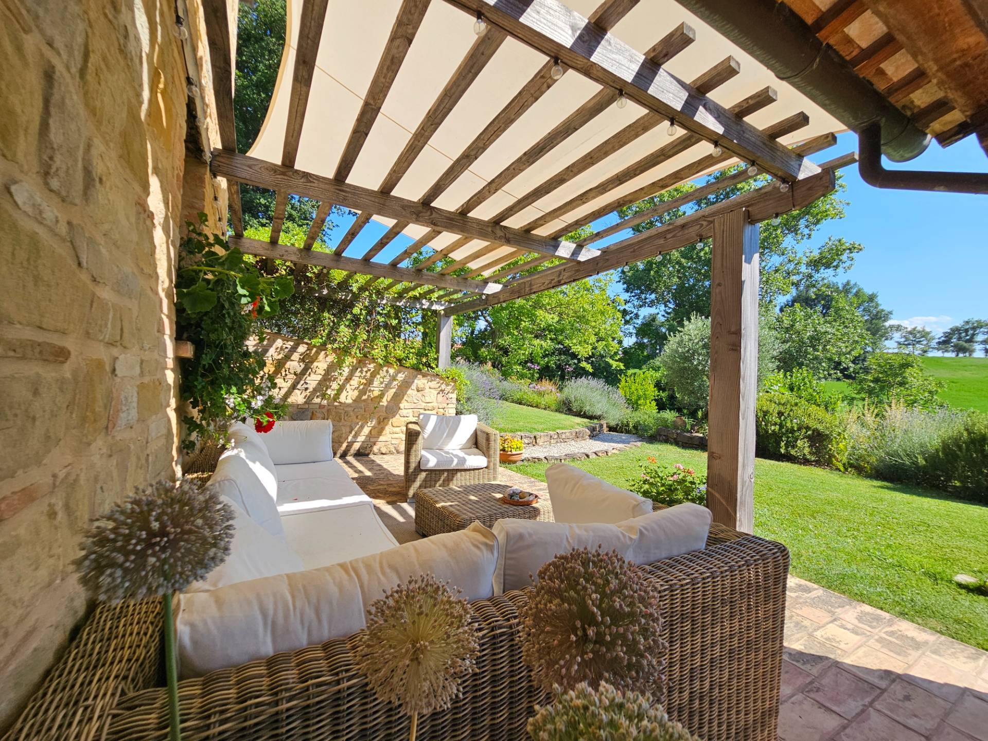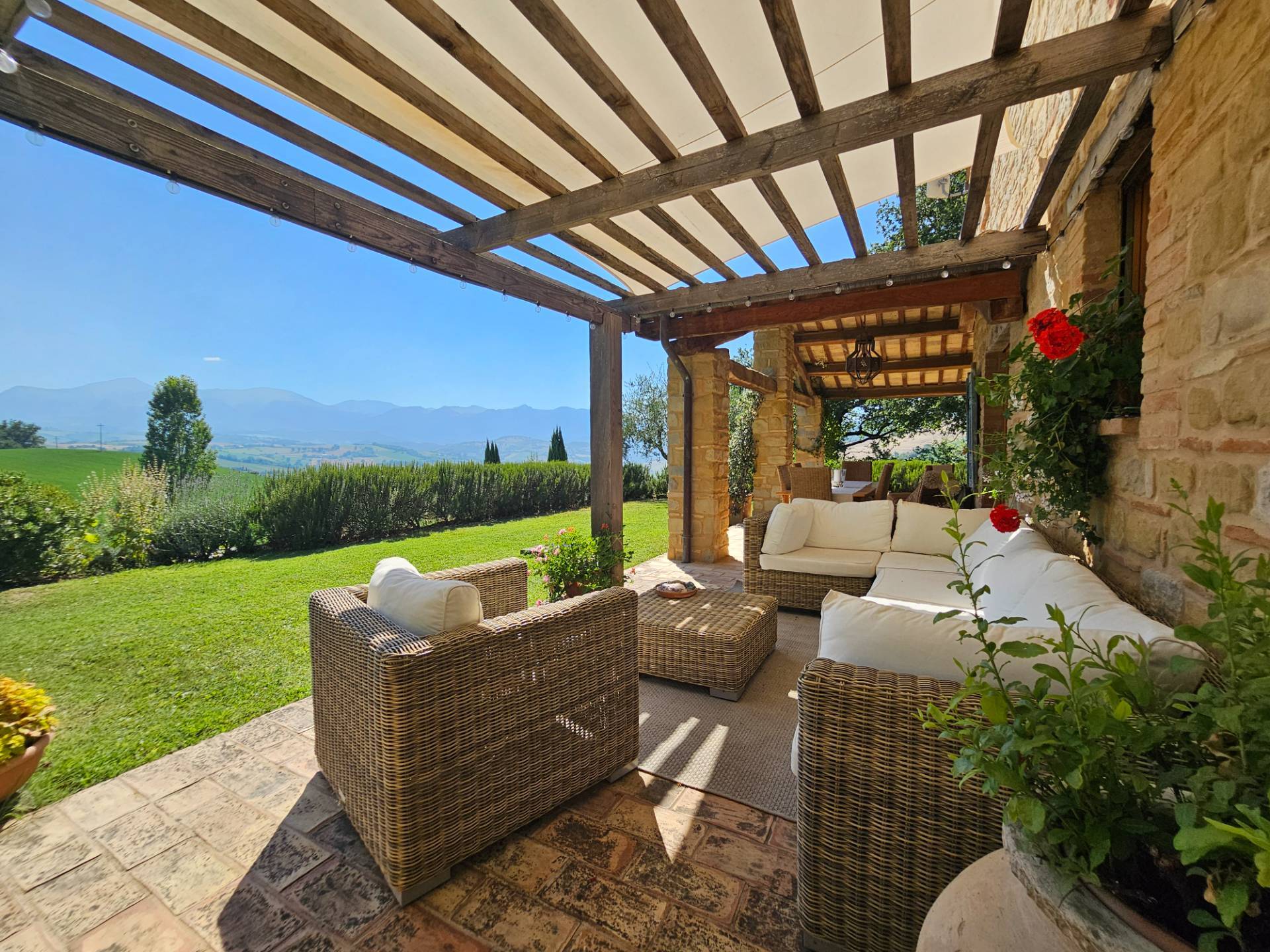 Esternamente il casale è dotato di un grande caratteristico portico con angolo BBQ ed un pergolato in legno, arredati con eleganti tavoli e sedie e comodi divani da cui poter contemplare il panorama.